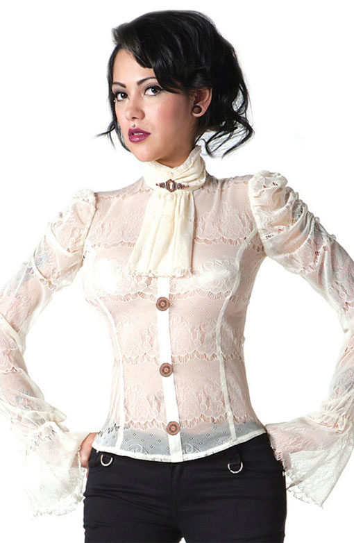Very interesting style lace blouses that have no collar at all - The upper part is made in the style of Carmen and demonstrates the seductive female shoulders. Such models are most often found in the free or flared version. They give the image a special lightness and transparency, and the unusual shape of their sleeves makes all the movements of the arms subtle and airy.