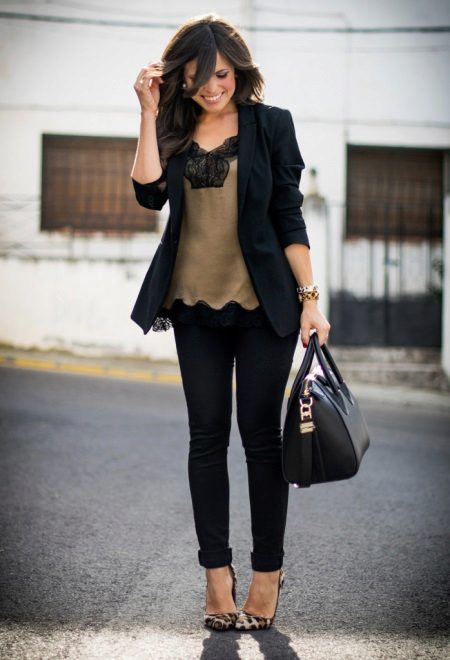 The combined model of a light brown blouse of chiffon and black lace is very suitable for the image of a business girl. The presence of a lace ruffle on her bottom is successfully combined with the black color of the main suit, and bright shoes and accessories with leopard print dilute the overall strict color.