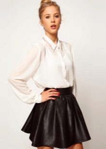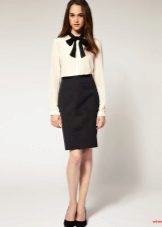 The game of contrasts is always in fashion. A snow-white sleeveless blouse with a black bow looks great in tandem with a black denim skirt with a straight button cut. This image is perfect for work, study or for every day.