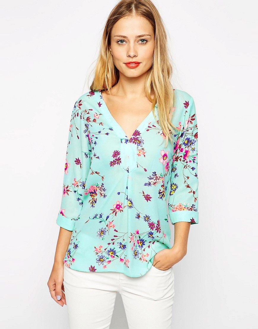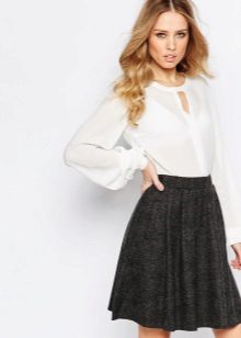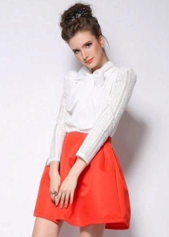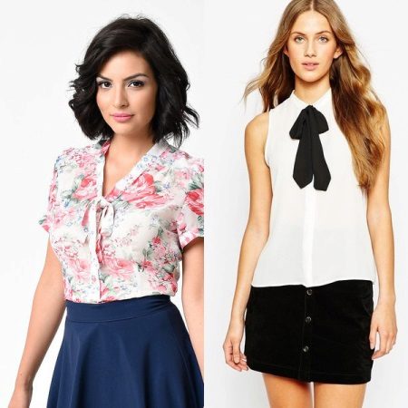 Elegant blouses are beautifully combined with skirts of any style and color scheme. A light-fitting blouse, decorated with a floral print, with a short sleeve and a delicate bow can be combined with a short flared blue skirt. This bow is different romance and tenderness.