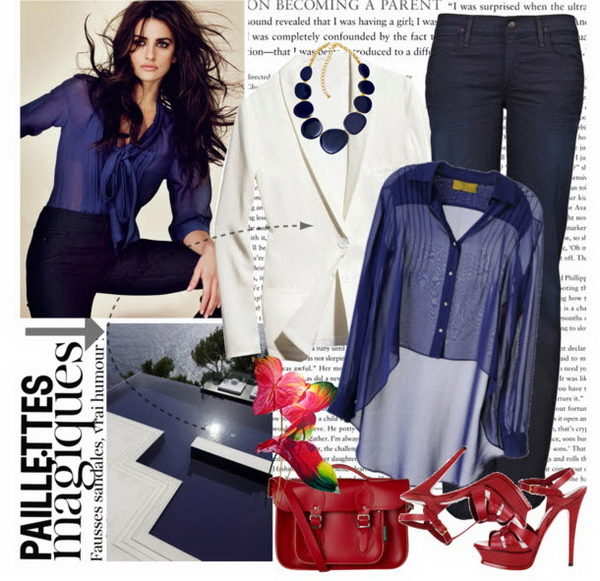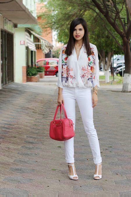 For a casual look, you can choose an elegant blouse with comfortable jeans. A rich blue blouse made of translucent fabric with an asymmetrical bottom with a luxurious bow can make an excellent tandem with blue jeans with skin-tight cut. A beautiful addition will be burgundy sandals on the hairpin and a small handbag in the tone of the shoe. A snow-white jacket with a classic cut will add to the image of a holiday note.