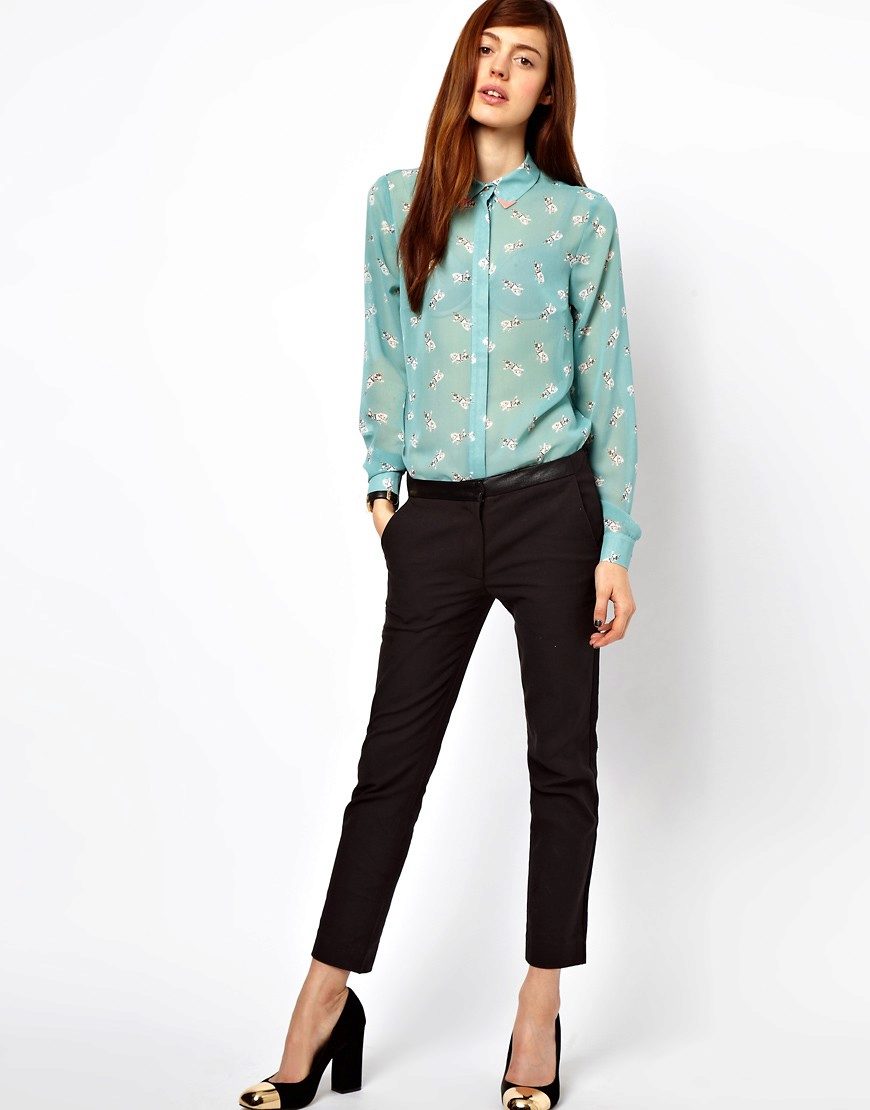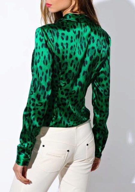 Many elegant blouses are presented by bright, saturated tones. An excellent ensemble consists of a classic model of bright green color, decorated with a leopard print, with white trousers with a fitted cut.