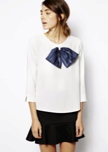 The classic combination: an interesting cut black blouse with a large bow tied at the side + snow-white skirt.