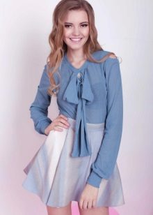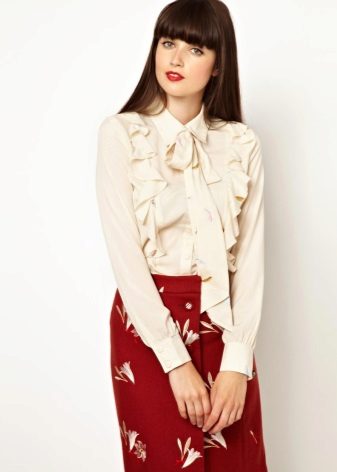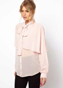 A blouse with a bow often has a classic cut. It can be straight or slightly fitted. Sleeves come in different lengths, most often they are complemented by cuffs. The color scheme of such blouses can be any. To create an office style, classical or pastel colors are preferred.