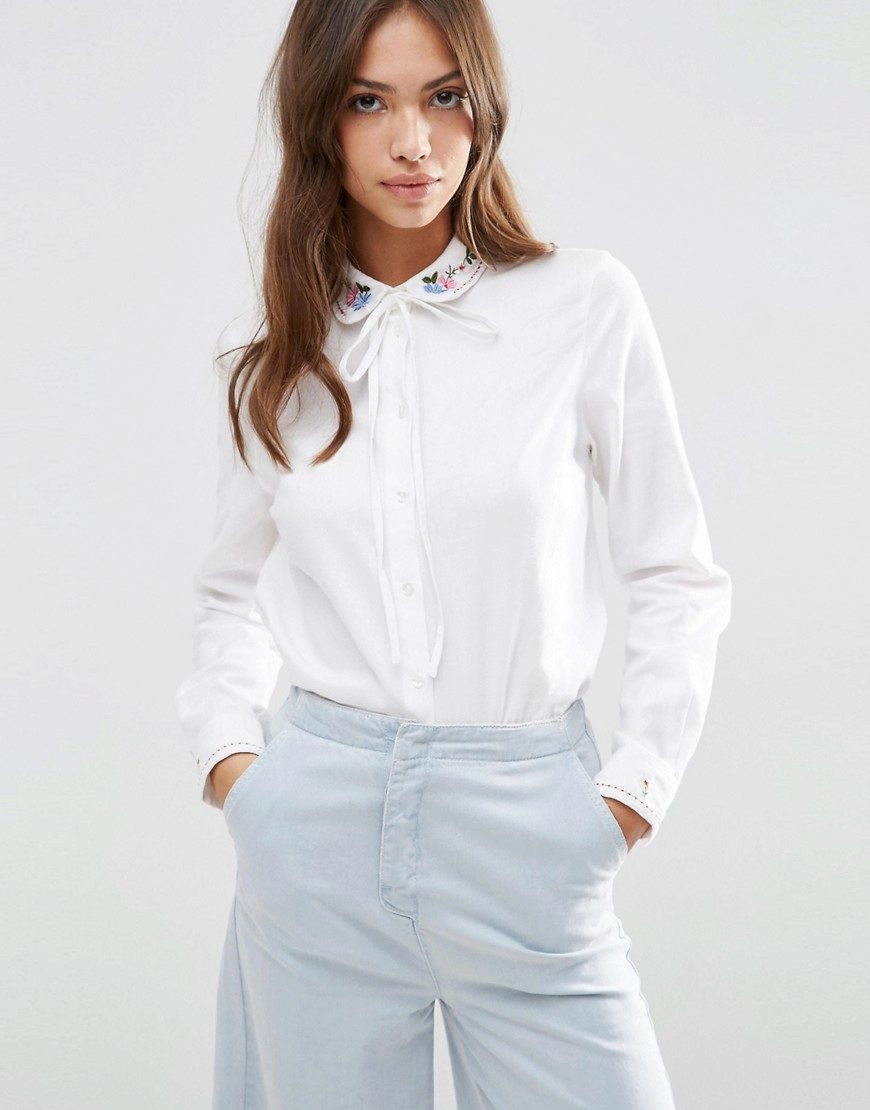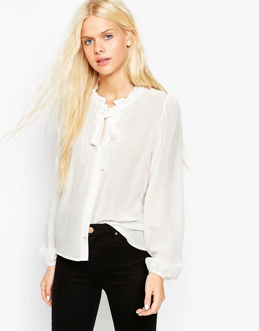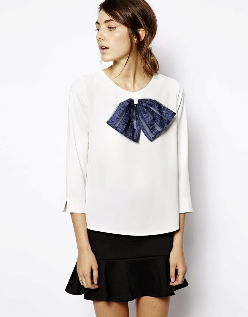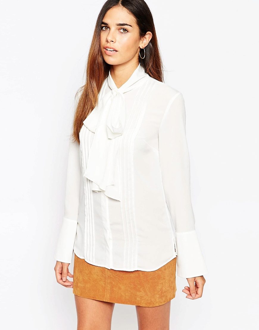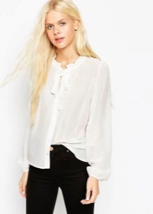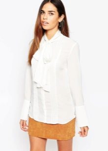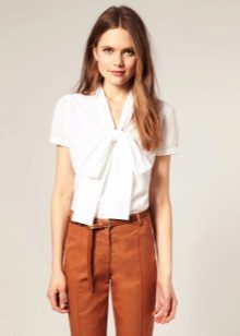 White blouse, decorated with a bow, is ideal for any business suit. The bow allows to soften a dry, official image, to make it more feminine and soft.
