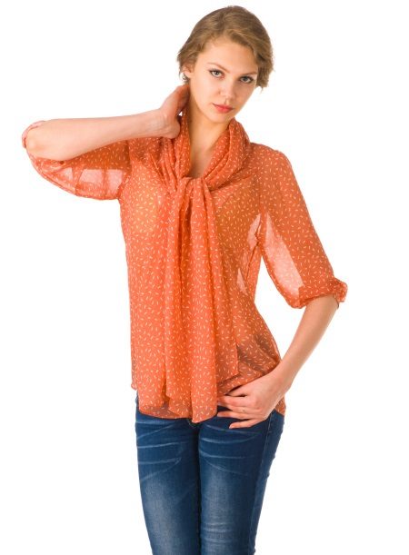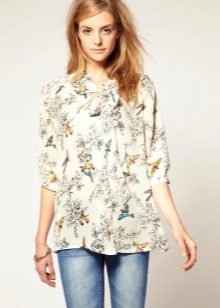 A blouse made of colorful chiffon blends perfectly with jeans and creates a set for everyday use.