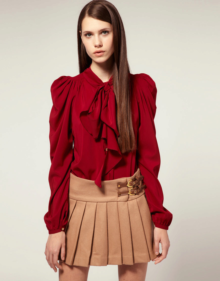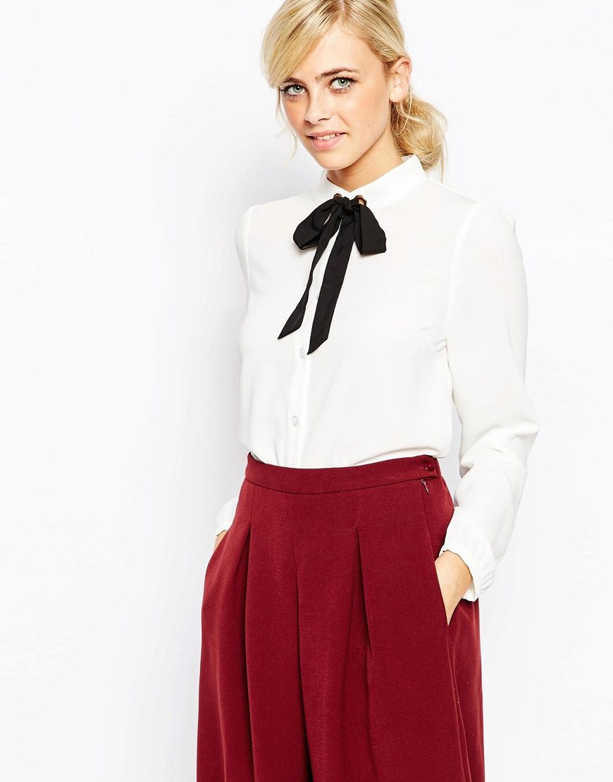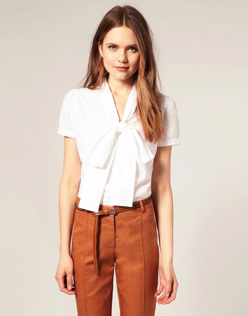 A blouse with a bow, especially in combination with a business suit, looks great with high-heeled shoes. Sandals, moccasins, ballet flats and other shoes with a flat sole can be matched to a less formal image.
