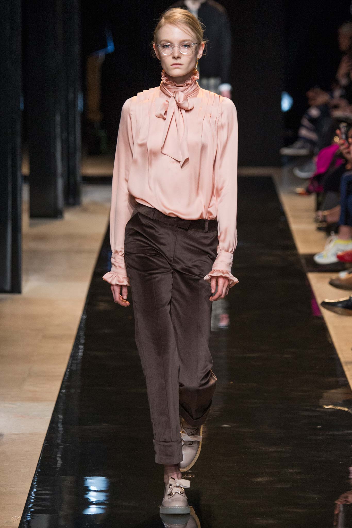 Another original version: a beige blouse of sophisticated cut with open hands and a basky + black pants.