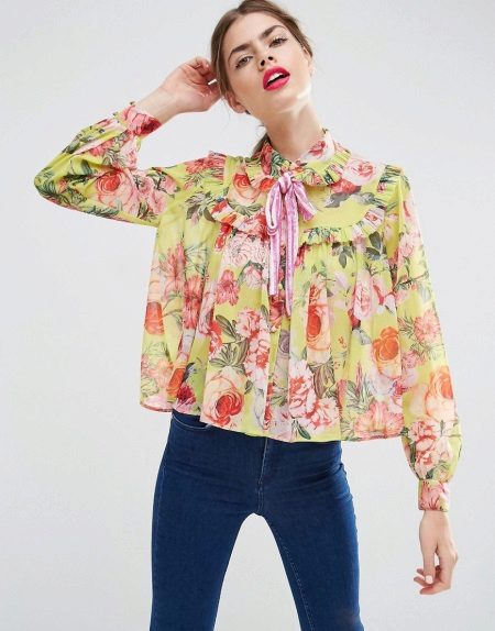 Every day for such a blouse, you can pick up flared, straight or skin-tight jeans, a skirt on a yoke or pleated.