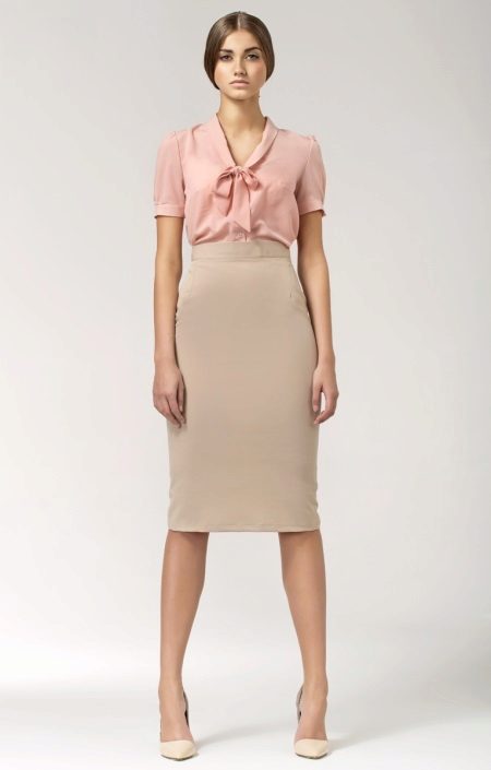 Perfect for the office: light chiffon blouse in soft pink color + beige pencil skirt + elegant shoes in tone to the skirt.