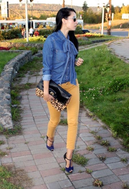 An interesting option for every day: blue denim shirt blouse cut and sandy-colored cropped trousers + blue heeled sandals.