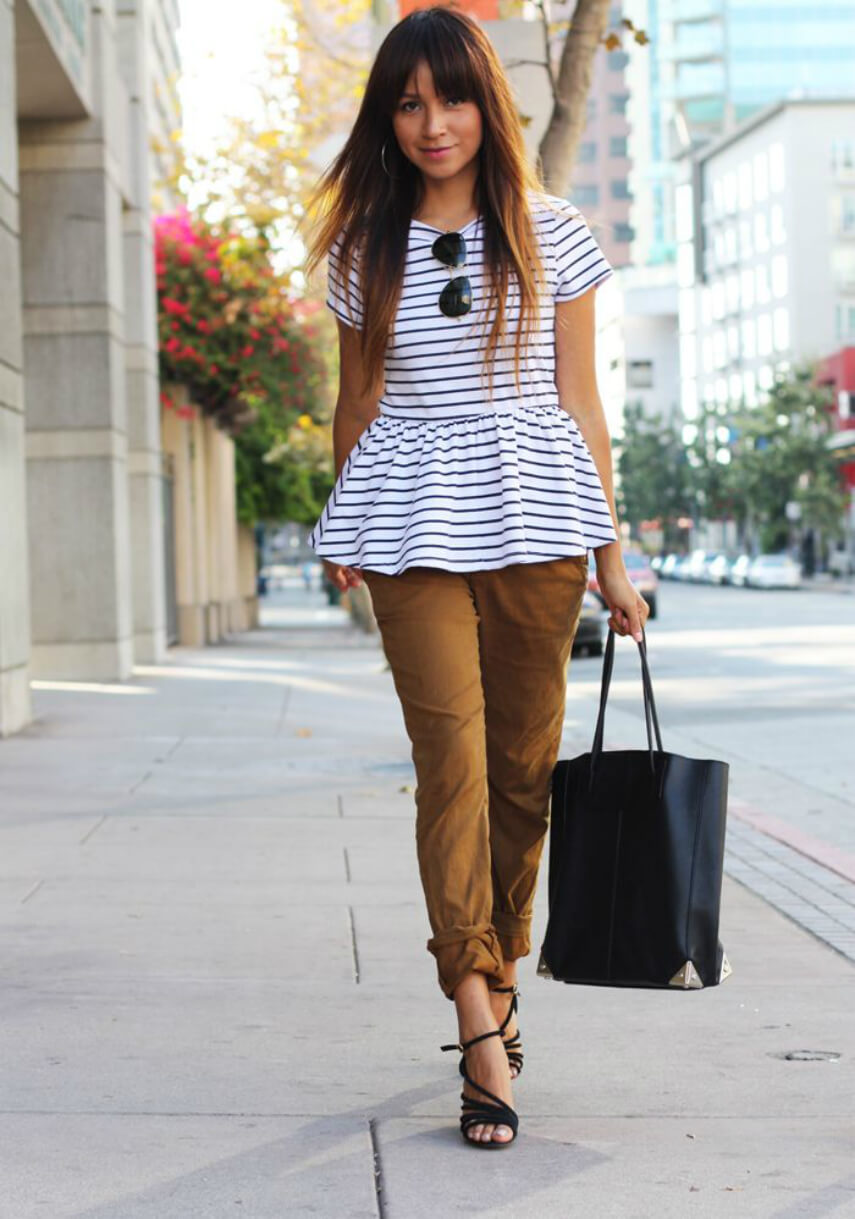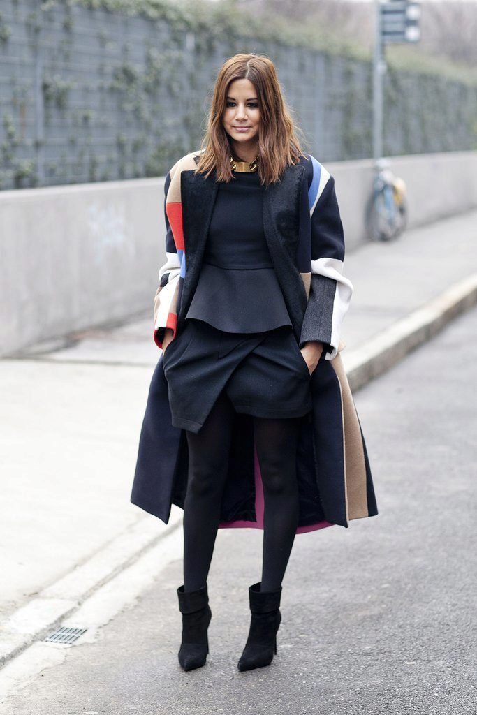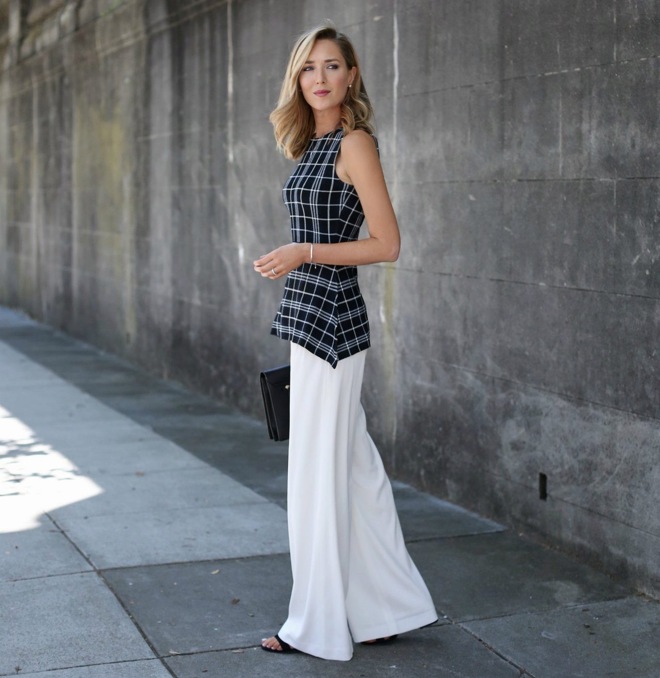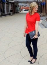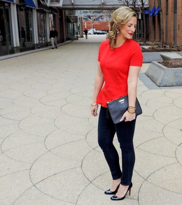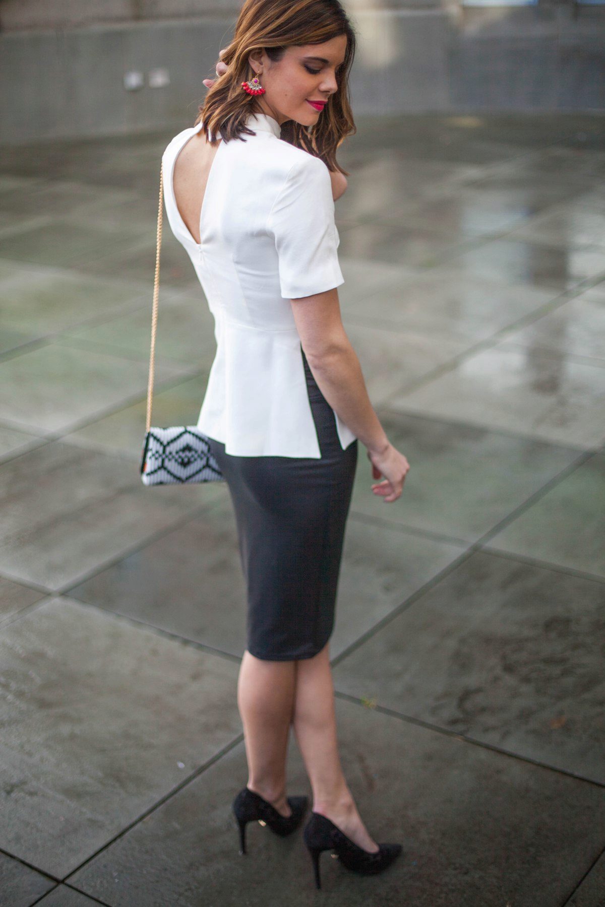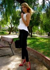 Classic black ankle pants and black heeled pumps will add elegant severity to the silhouette. The addition of a black thin belt for a blouse and a tonal bag is appropriate.