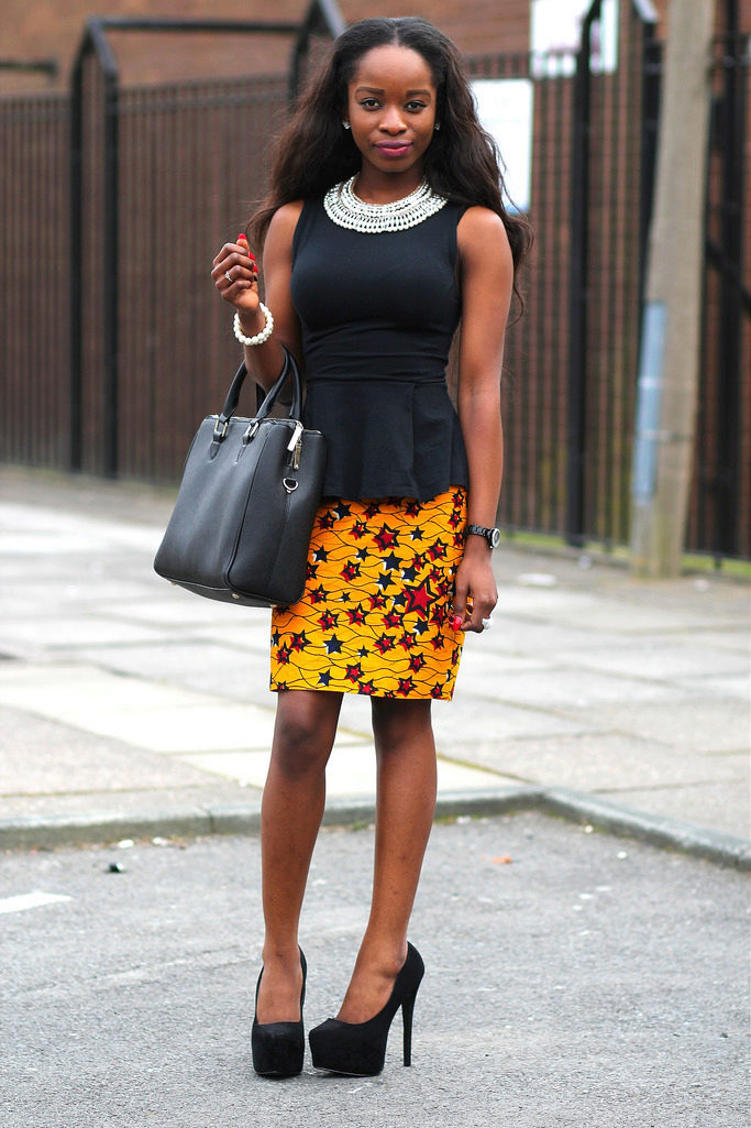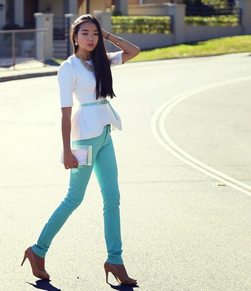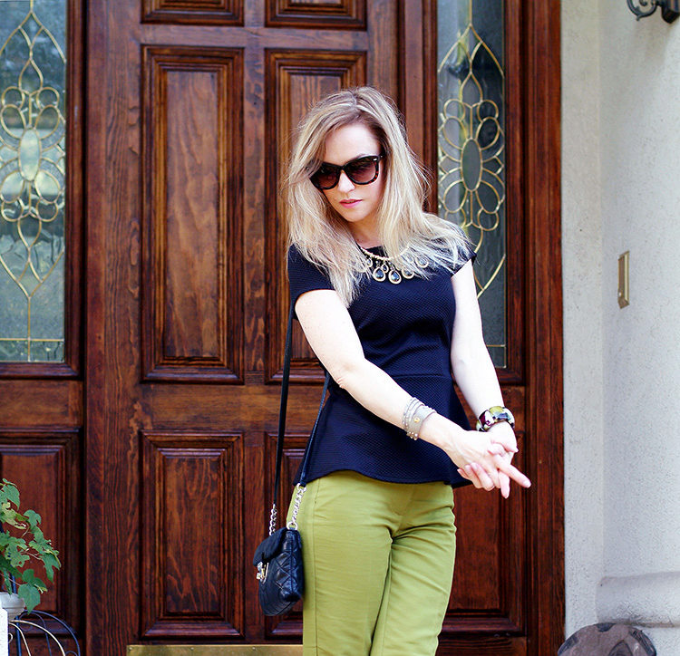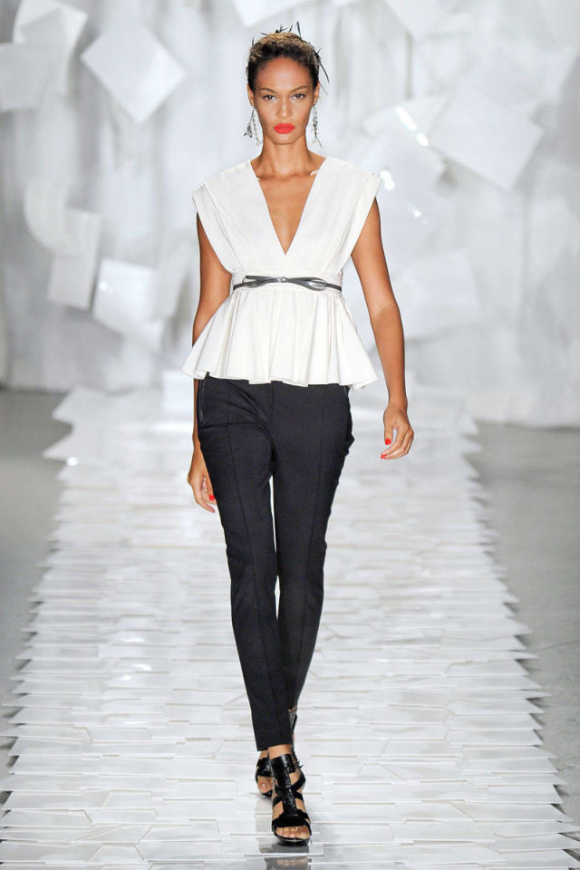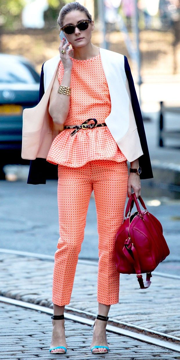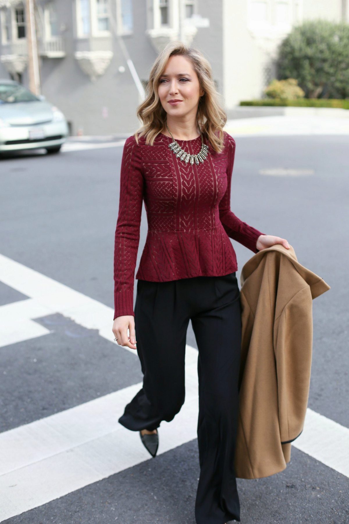Classic black ankle pants and black heeled pumps will add elegant severity to the silhouette. The addition of a black thin belt for a blouse and a tonal bag is appropriate.