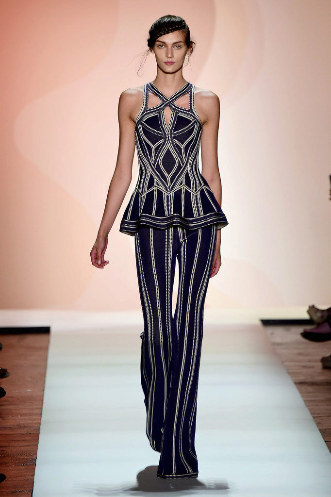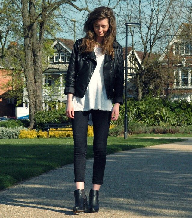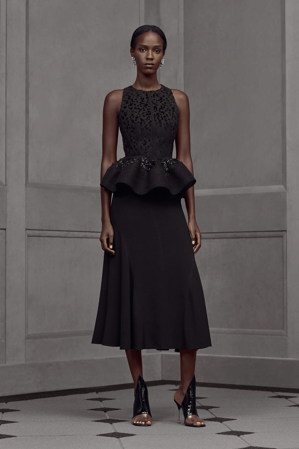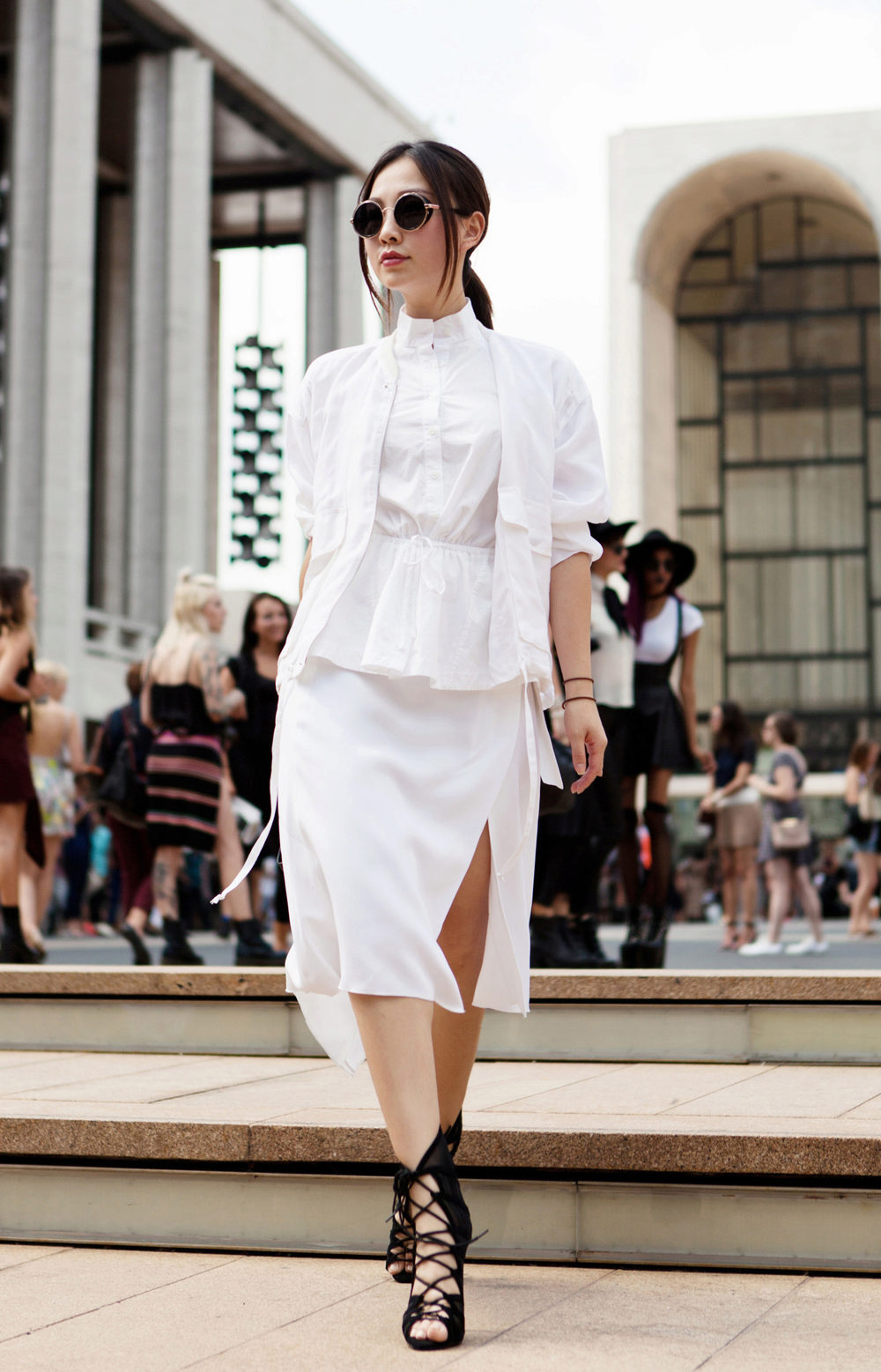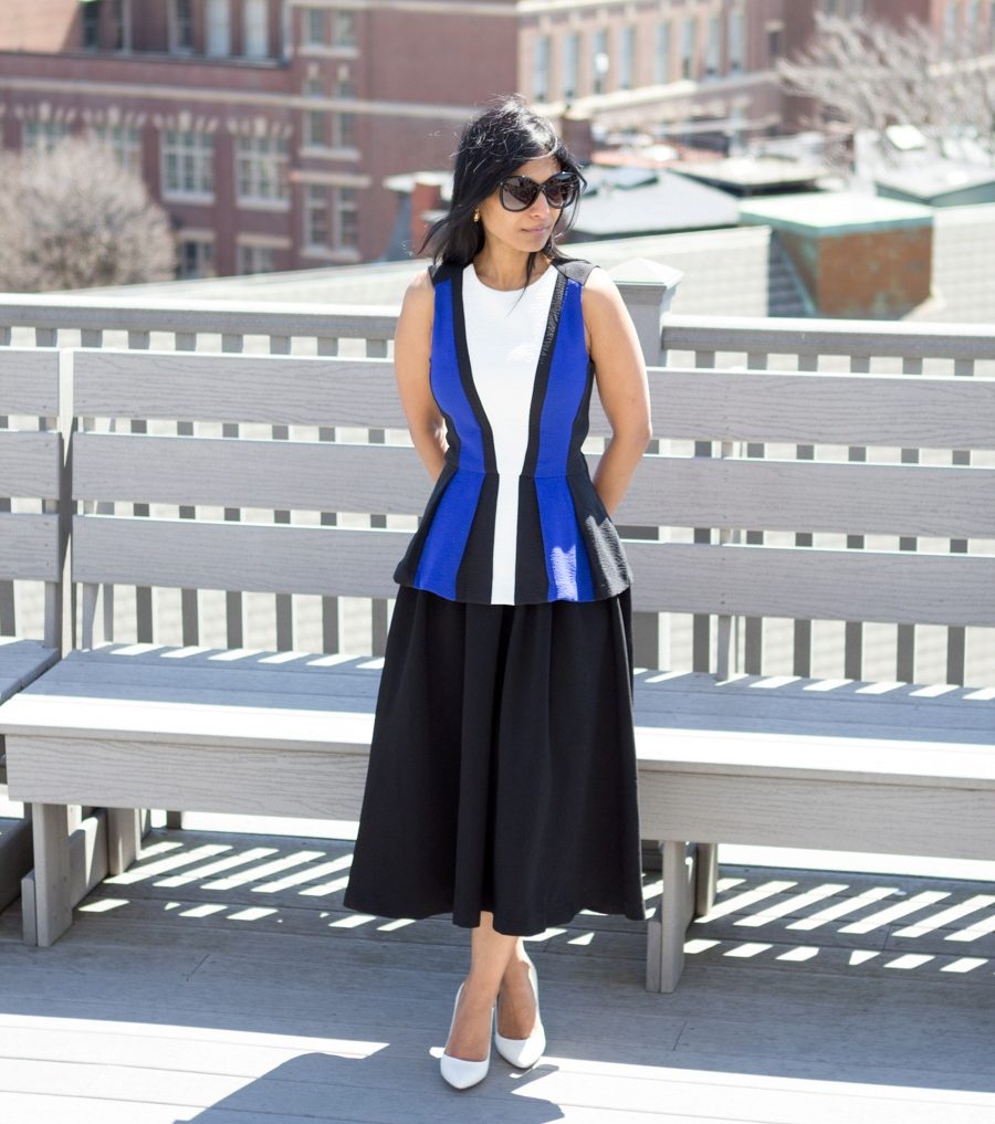 Classic black ankle pants and black heeled pumps will add elegant severity to the silhouette. The addition of a black thin belt for a blouse and a tonal bag is appropriate.