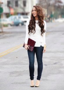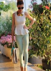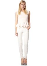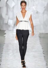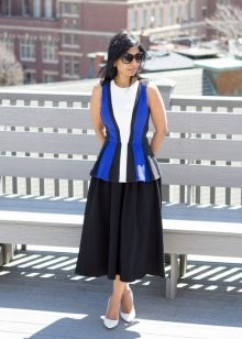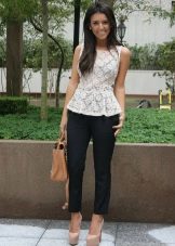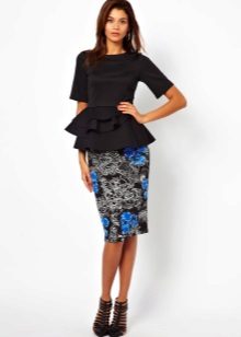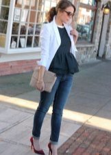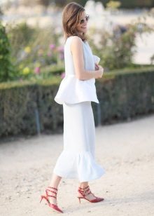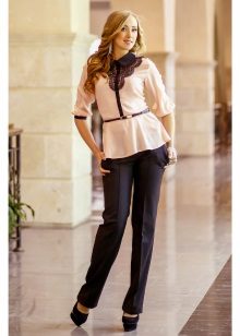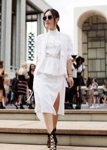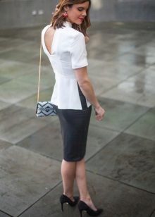 For the office is relevant version of a white blouse with a basky. Sleeves ¾ with thin cuffs, stand-up collar, the classic version of the Basques at the waist. Pick up a black or blue knee-length skirt. Wear heeled shoes on your feet.