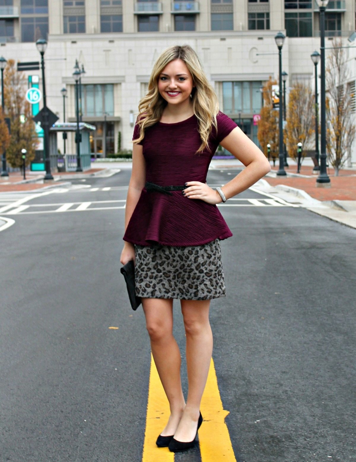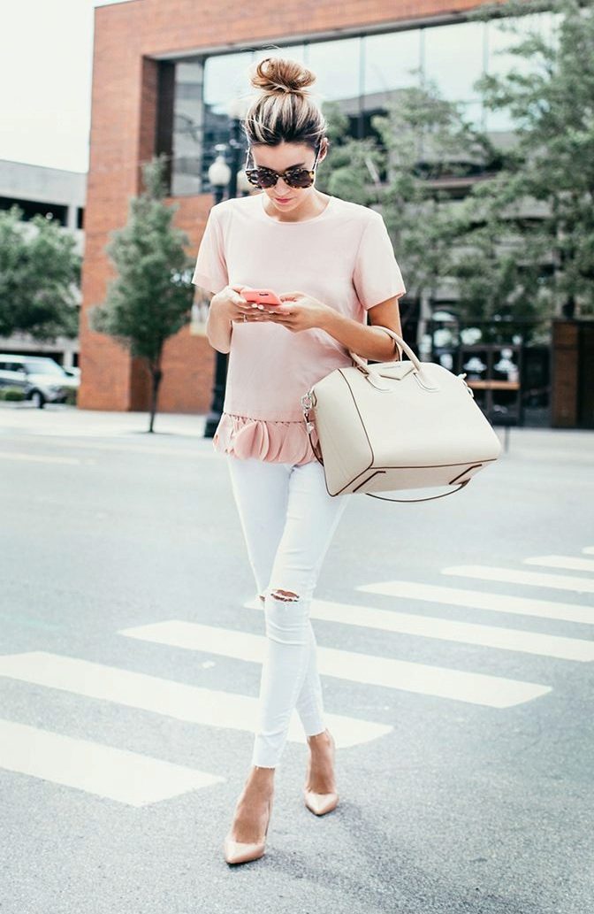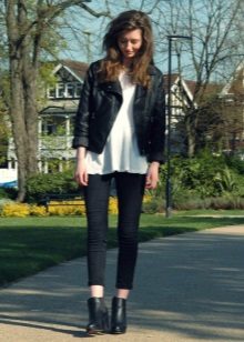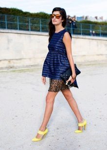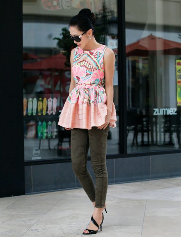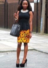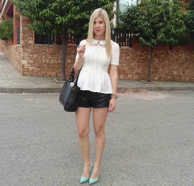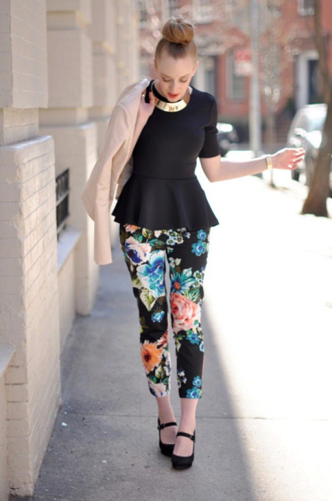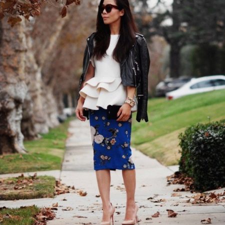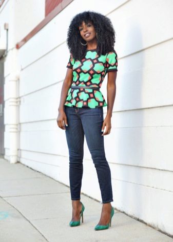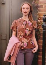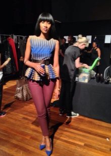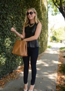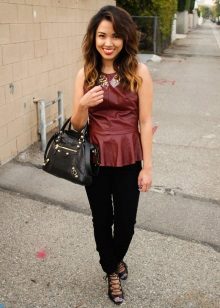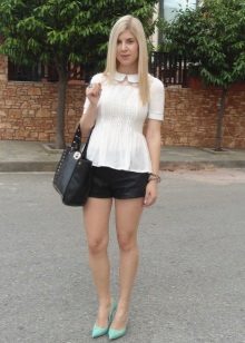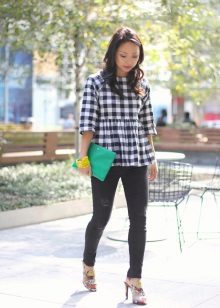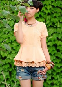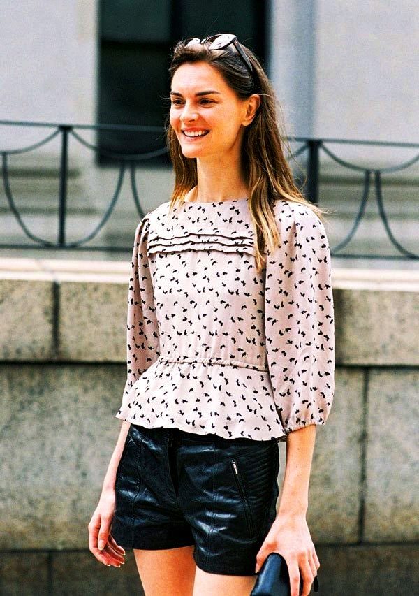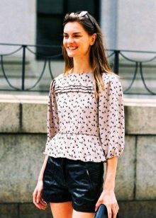 - Casual chic. For weekdays, pick up an unusual printed blouse with a basque: without a collar, 3/4 sleeves, wide at the shoulders and narrowed to the bottom. Baska starts just below the waist. On the blouse, small ruffles are possible at the top. Romantic blouse calm diluted with black leather shorts with zippers at the pockets. Wear boots with laces or ballet flats.