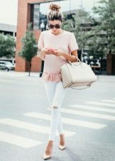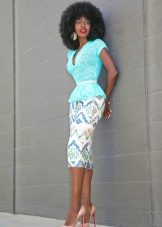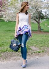 For a stylish bow pick up a blouse with a basky sleeveless. Light denim, blended with lace to match the tone, fits the figure. Baska begins just below the chest, to the bottom becomes wider.