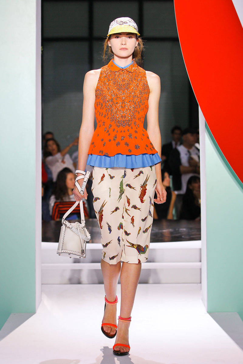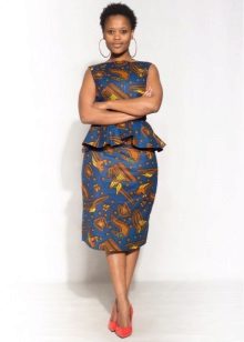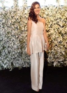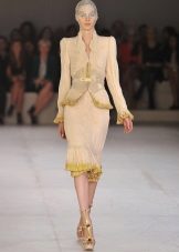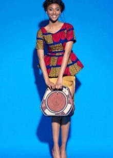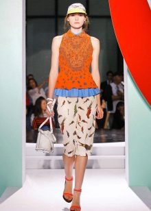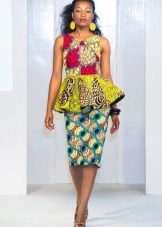 - An elongated fitted blouse made of thick beige fabric slim silhouette. The long Basque, reaching to the middle of the thigh, develops in smooth waves. Her curvature continues with a colorful fluffy skirt. An unusual combination, bright and interesting. It can be supplemented with a thin belt, high heels and accessories.