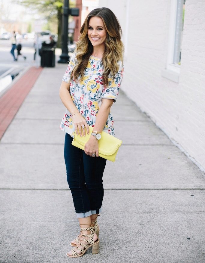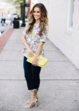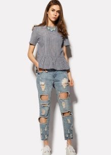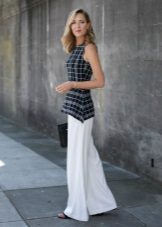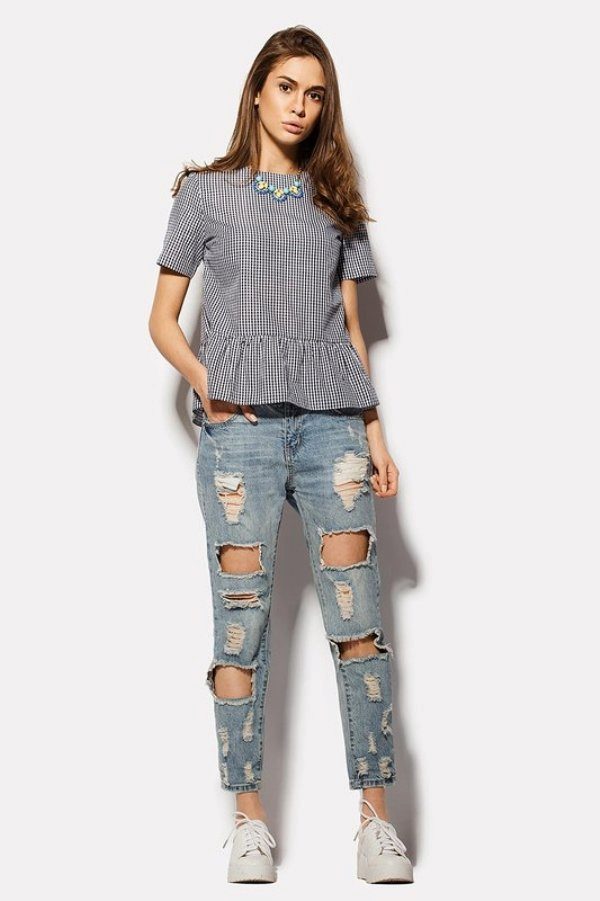 - You should not forget about simple blouses with basky with short sleeves. The most simple cut, similar to a wide T-shirt, checkered print with a calm combination of colors: black and white. Boyfriend jeans with holes, a bright massive necklace and sneakers are a simple, stylish and practical bow for every day.