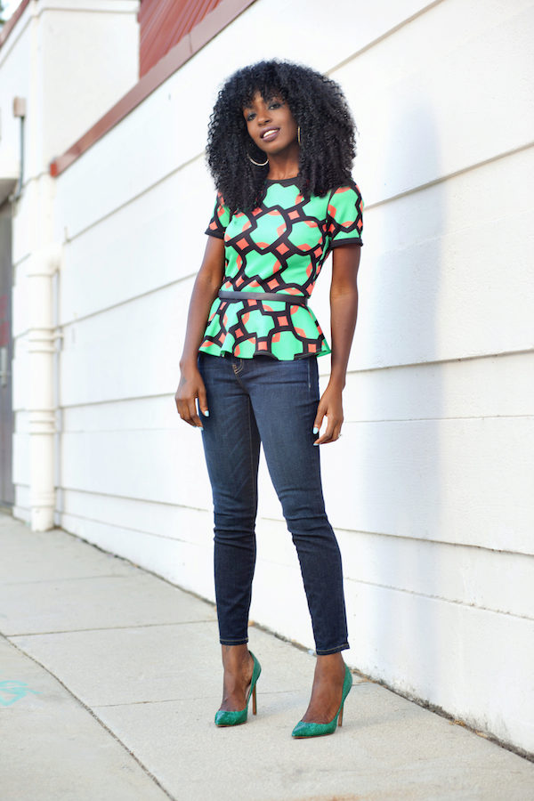 Wings sleeves, chiffon fabric, wide basque expanding begins at the waist level and ends just above the hip. Wear denim shorts with printed pockets and ballet flats.