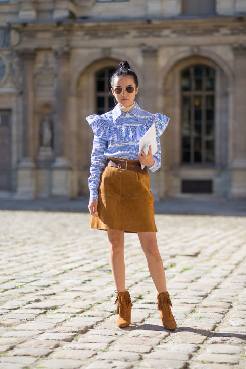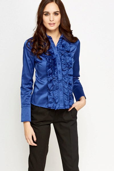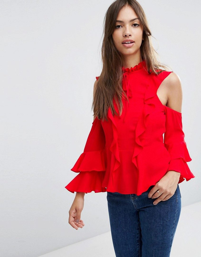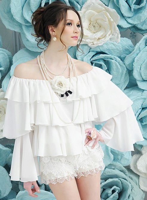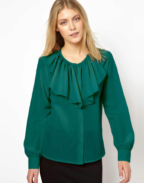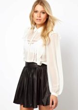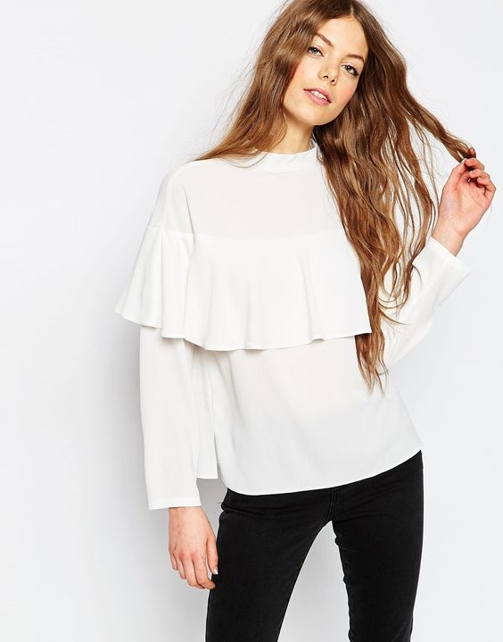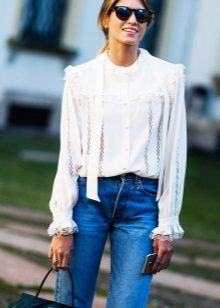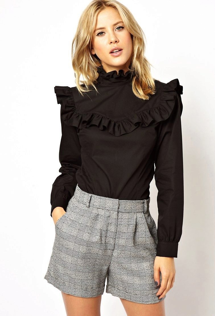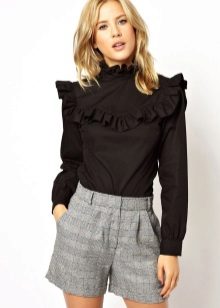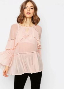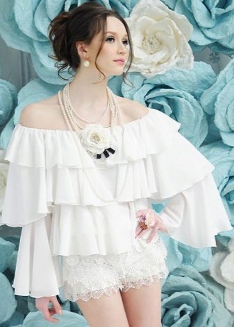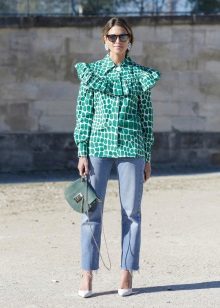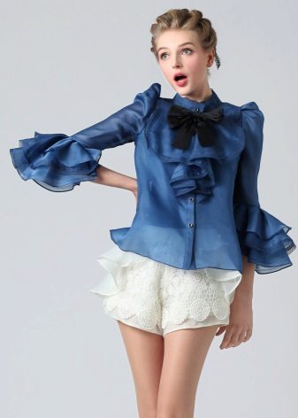 Blouse with frills looks very stylish. A long sleeve in such a model does not interfere with open shoulders, and a loose or slightly fitted cut looks very enticing. Thin girls with small breasts such blouses are most suitable, as the shuttlecocks perfectly hide not too lush bust. The image with such a blouse immediately becomes sensual and seductive.