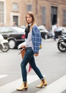 Wear a white blouse and denim pants for a comfortable outfit get-together. The original satin scarf, as an accent in the image, makes it more interesting and stylish.