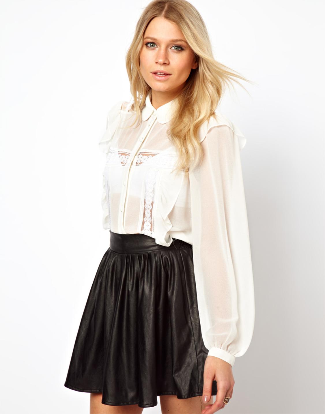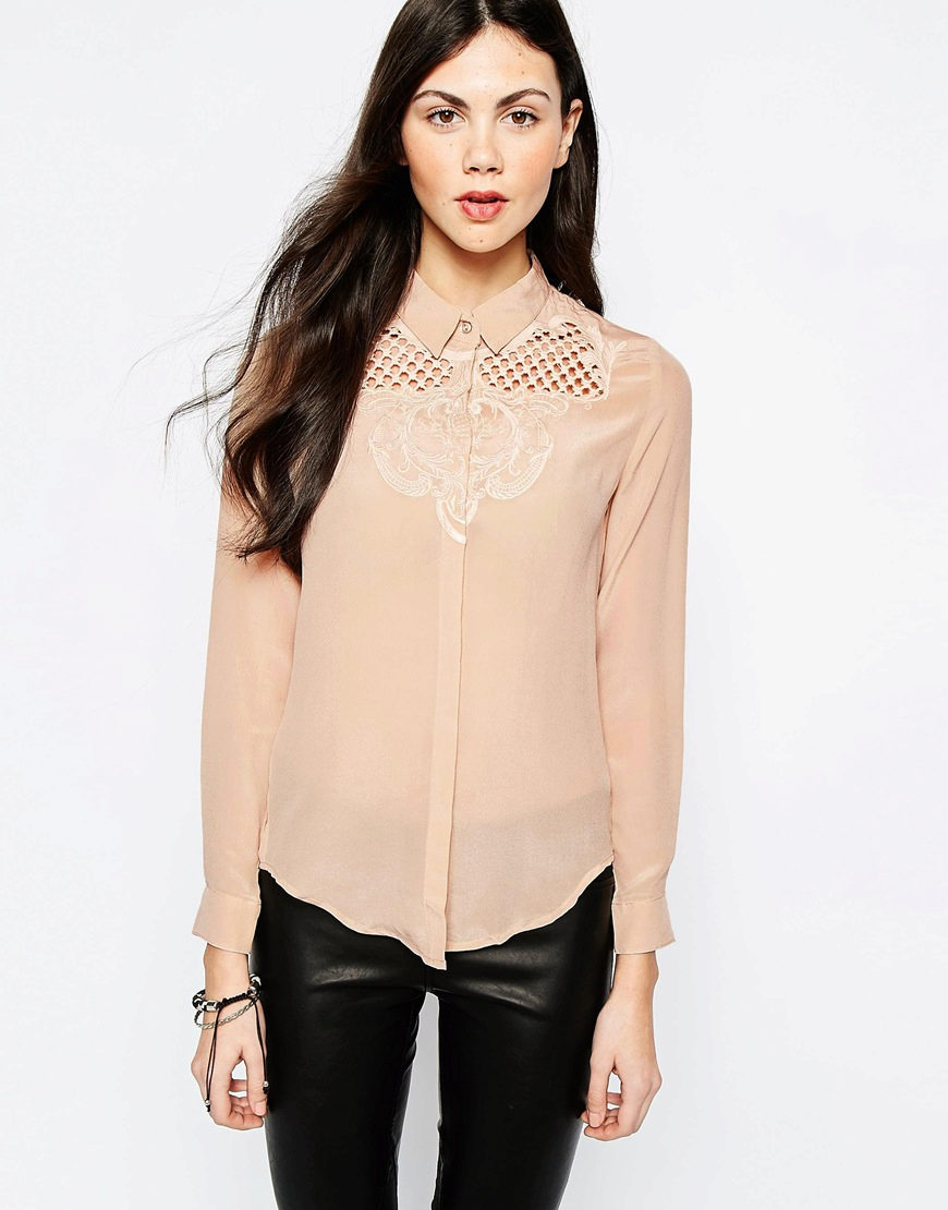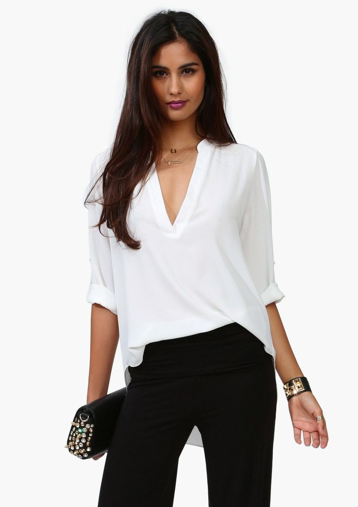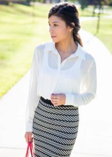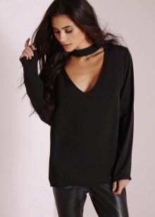 Long-sleeved blouses, with a deep neckline or neckline, give the look a very piquant and seductive look. The presence of an open neckline is more than compensated by closed hands, which create balance in the image and do not allow you to look vulgar and bold.