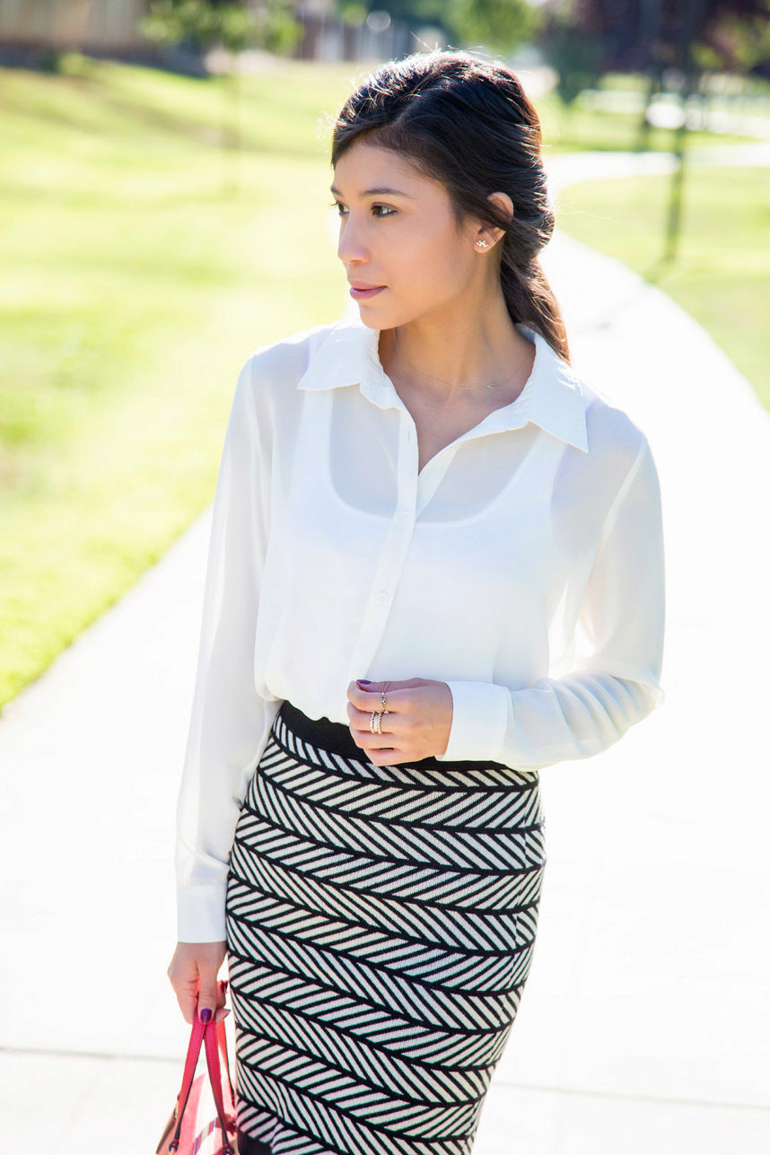 Classic business kit, including a strict blouse and a pencil skirt - the perfect ensemble for work. A black bag and matching shoes complement this formal look.