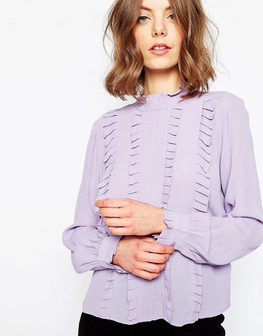 Blouses with ruffles suggest the use of tailoring only light and airy fabrics, such as silk or chiffon. Such models give the image an incredible sophistication and airiness. Just like models with flounces, a blouse with ruffles will help correct the problem of a small breast, successfully disguising it with its pomp and volume. Such blouses will be relevant both on a date and in the office, it is only important to choose the right color and transparency of the fabric.
