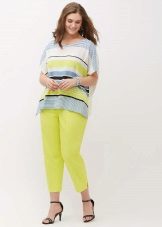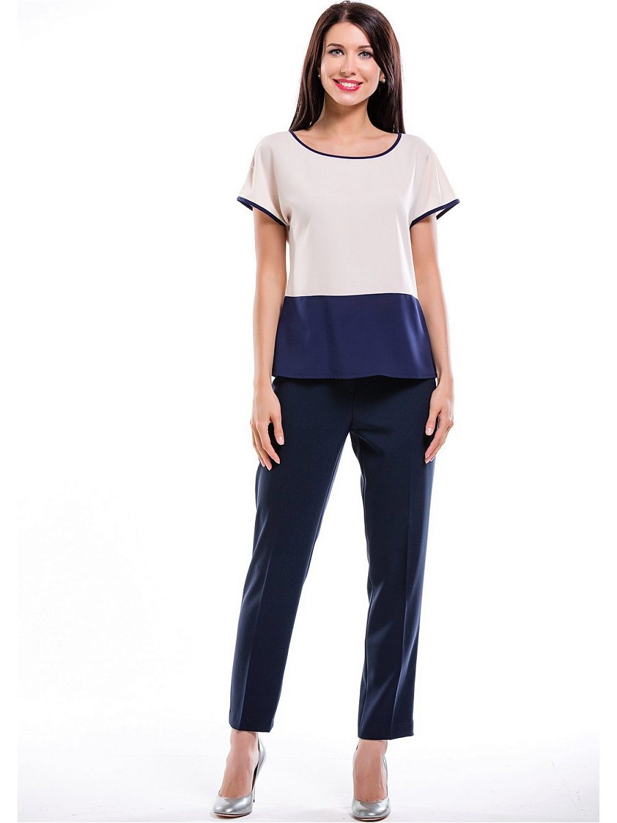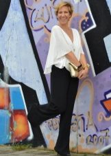 In combination with a blouse, black straight-cut trousers with arrows will look good, it is best for the product to be tucked inside the pants. Thanks to stylish pumps with high heels and an unobtrusive bag - a striped clutch, the image will look complete and complete.