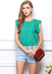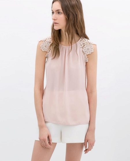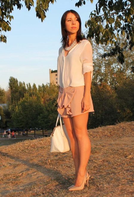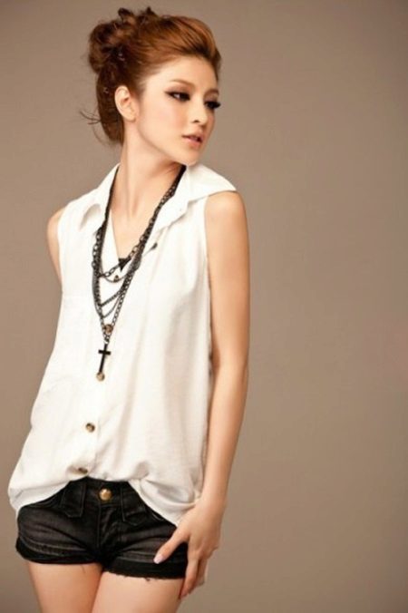 A lightweight sleeveless blouse is a great option for a summer look. In combination with such a blouse model, beige shorts-short skirts with a bow are perfect. As accessories, you can use different pendants, bracelets or watches. A perfect summer option for shoes will be flat sandals in white or elegant shoes with a thin high heel.