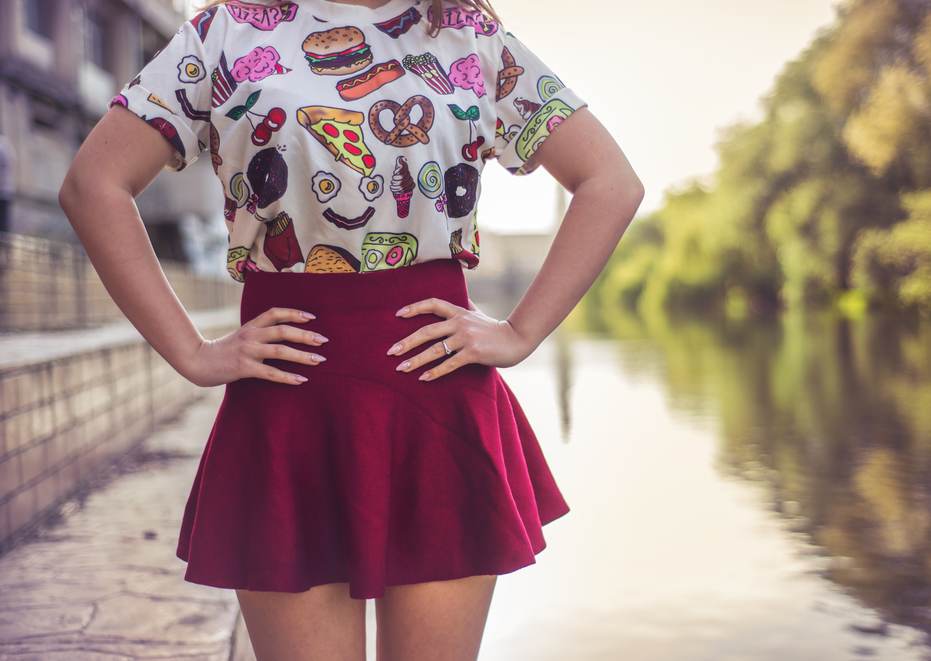 An excellent complement will be a metallic gold bracelet and high-heeled shoes to match the skirt.