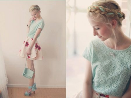 Sweet, romantic ladies are characterized by the same tenderness and romance in the image, which is sometimes very difficult to achieve, because quite sharp and coarse things of bright colors have recently become fashionable.But do not despair, because with the right combination of some models, your image will be the most sweet and gentle. For example, a mint chiffon blouse will be perfectly combined with a printed skirt-sun.