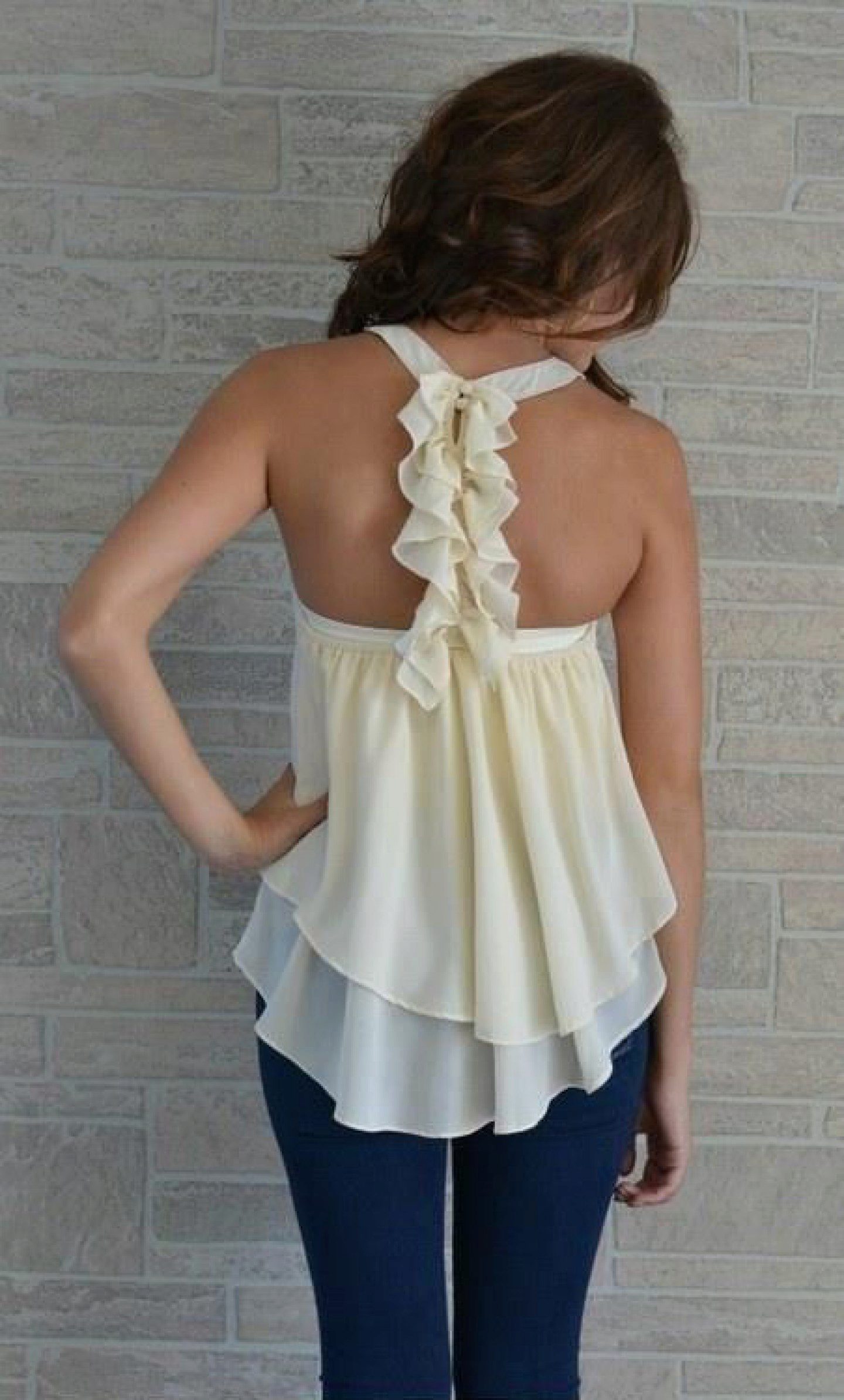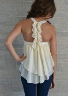 Sleeveless blouses with an open back are an excellent option for the summer. On a hot day, it is very pleasant to feel with the skin the coolness of a light breeze, which gives a deep cut to touch the back. The absence of sleeves makes this model more free-style, and allows you to wear it with shorts and short skirts.