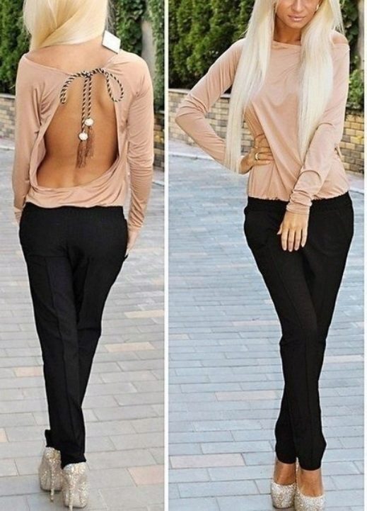 A knitted beige blouse with an open back and an original tie just above the shoulder blades very effectively demonstrates a slim figure, and strict classic trousers and shiny high-heel shoes help her in this.