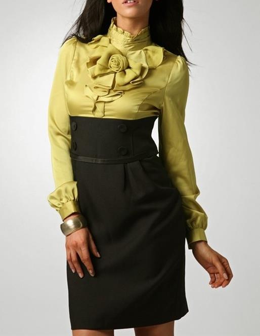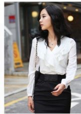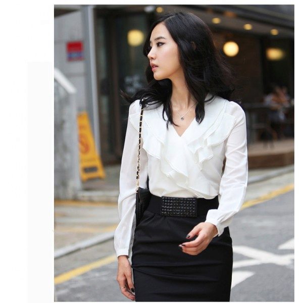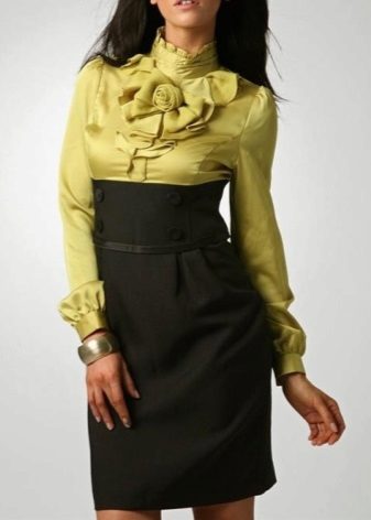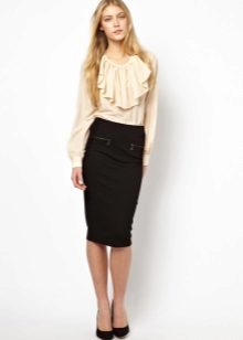 Stylish business look can be created from a strict blouse with frills on the chest and pencil skirts with a high waist. The combination of a white blouse with a gray skirt also looks rather strict.