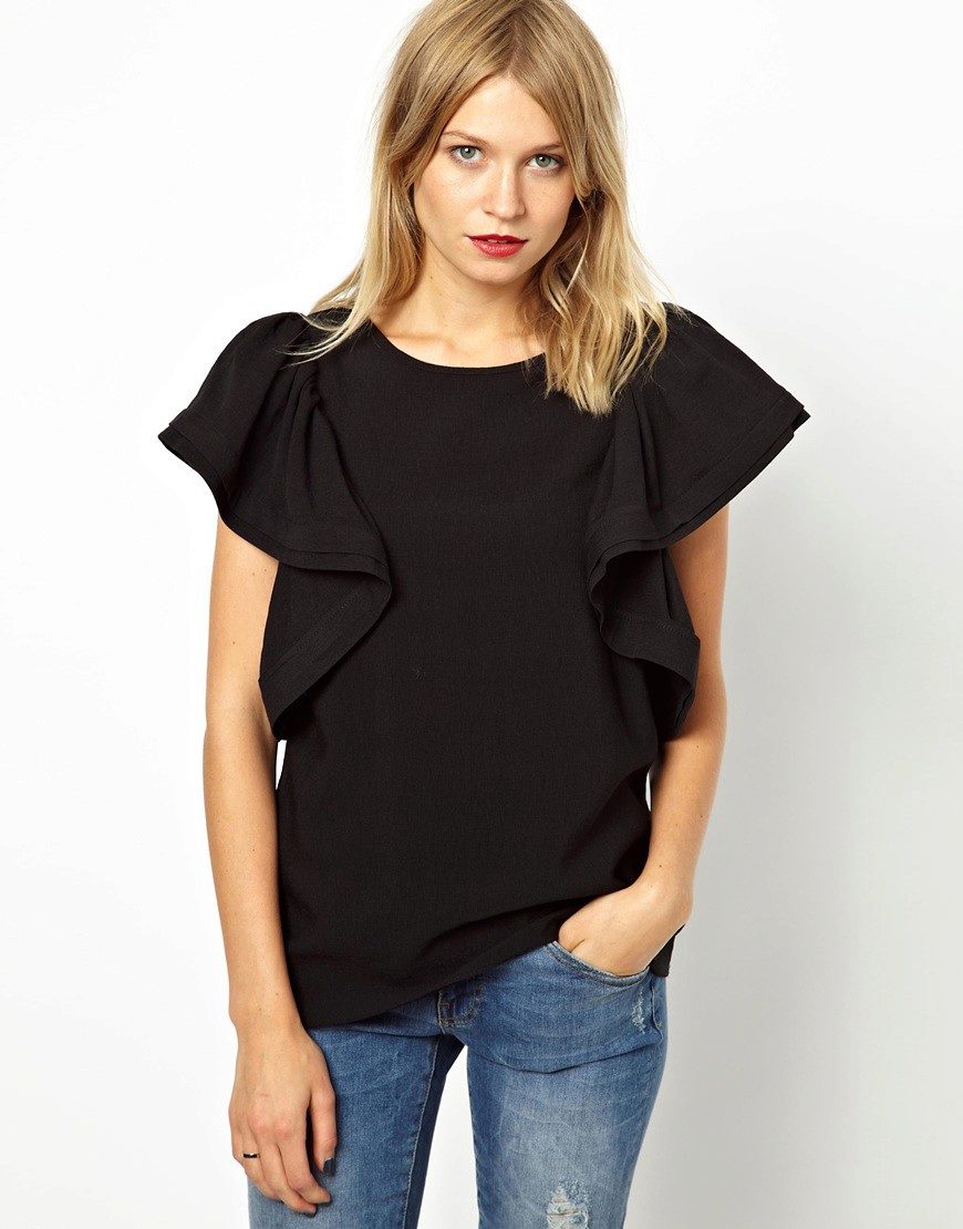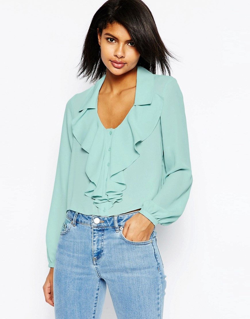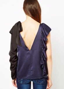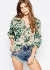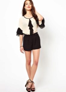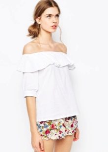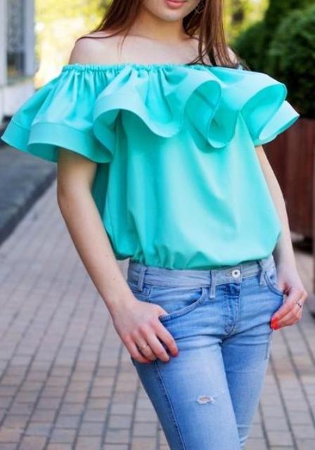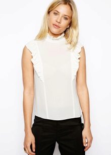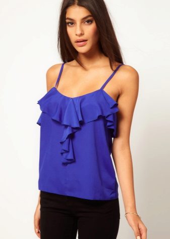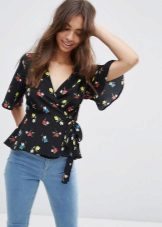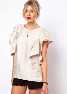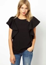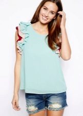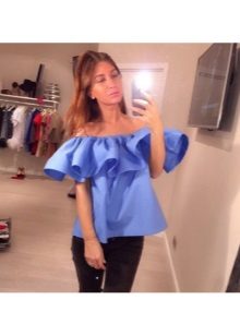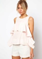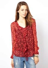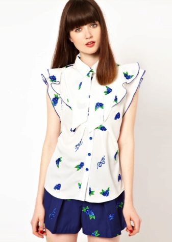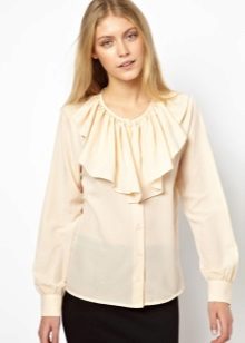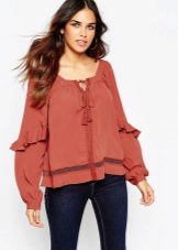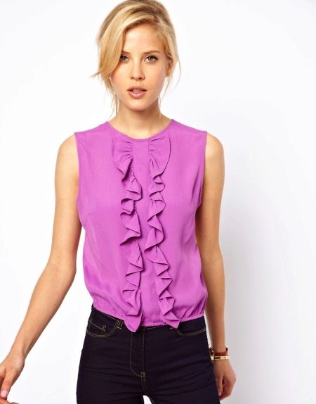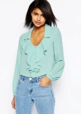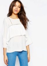 Many models of blouses with this decor can be worn with jeans, and summer options look good with denim shorts. In cool weather, a jacket, cardigan or jacket can be added to an ensemble with a blouse trimmed with flounces.