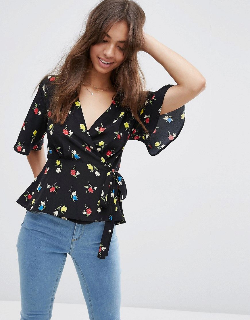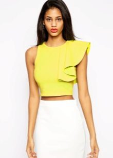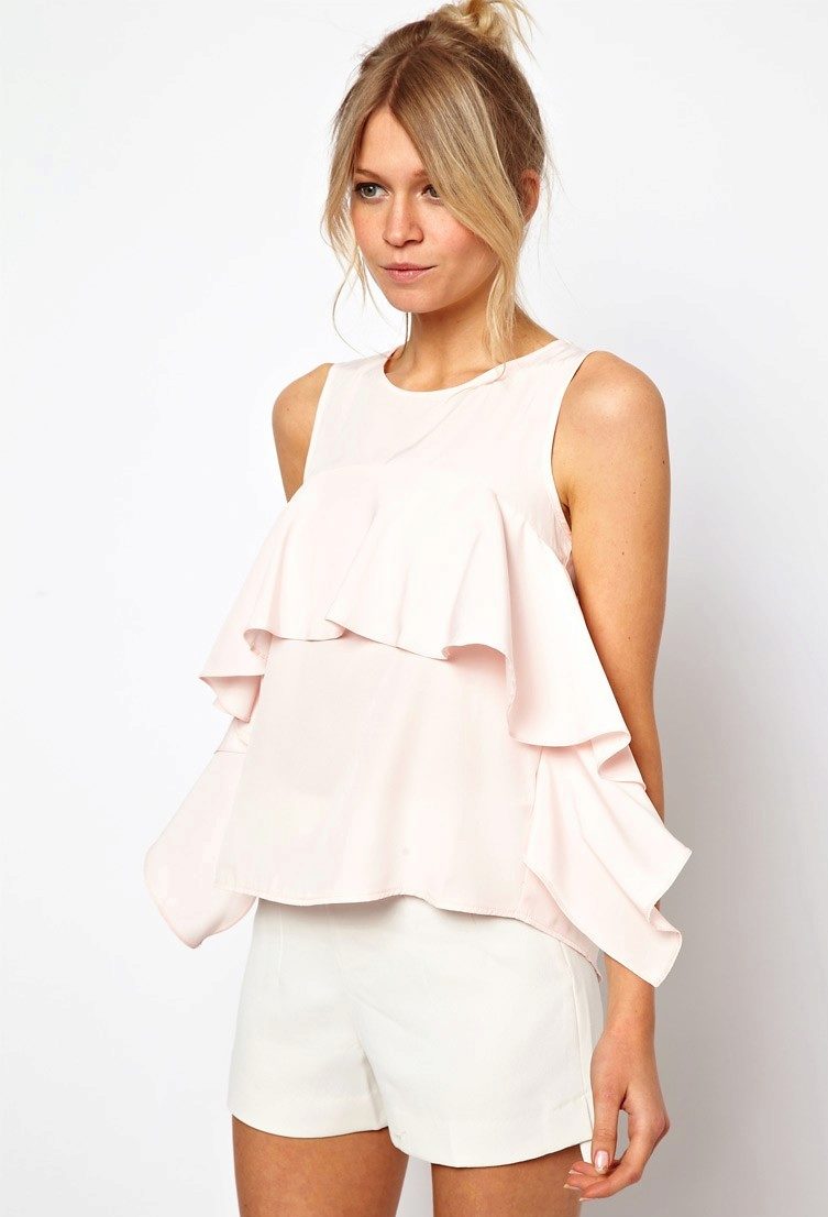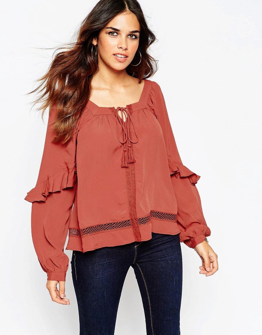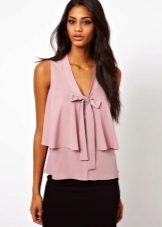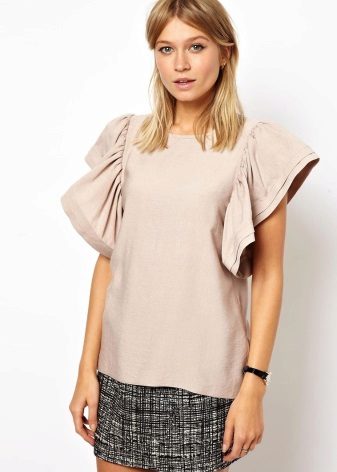 Many models of blouses with this decor can be worn with jeans, and summer options look good with denim shorts. In cool weather, a jacket, cardigan or jacket can be added to an ensemble with a blouse trimmed with flounces.