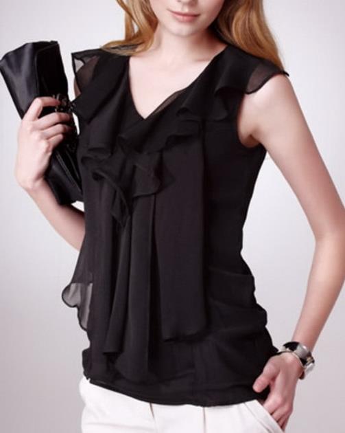 A light blouse with a flounce of translucent fabric looks good with light-colored trousers and black pants.
