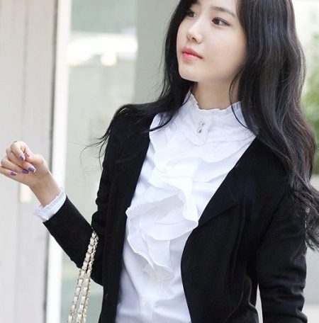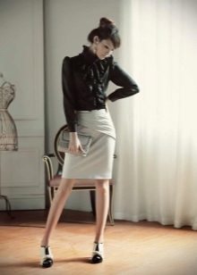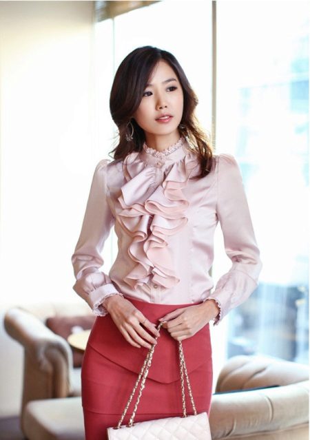 Pencil skirt and blouse with a wide elongated frill will be a worthy choice for an office style.