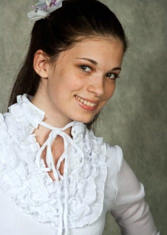 - With an extended sewing line. This jabot is cut out in the form of a triangle and sewn to the neck of the blouse.