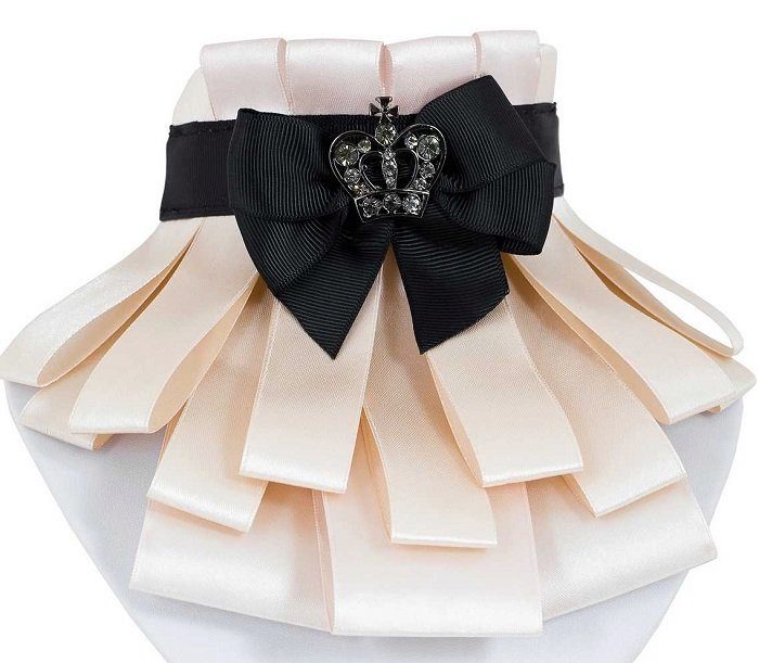 - With pleat folds. This frill consists of two parts, stitched together. Jabot is collected in such a way that resembles the folds of the bow.