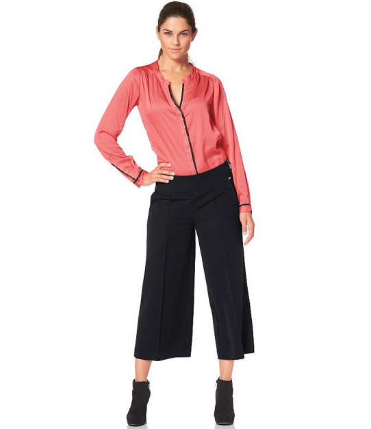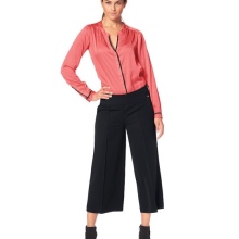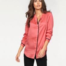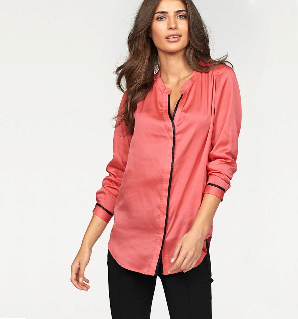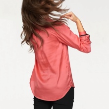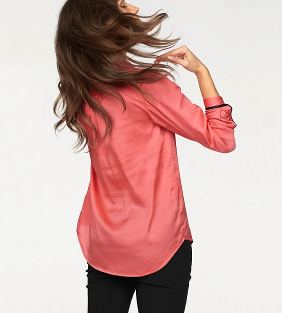Not only beautiful, but also practical satin blouse will suit both business and sport style. Slightly shiny satin is easy to clean and does not wrinkle. V-neck in combination with a stand-up collar looks very original, and black edging adds brightness to the image. Thanks to the tucks on the shoulders in front and behind, the blouse elegantly drops, adding femininity to the image. The original shape of the cuffs on the buttons adds convenience.