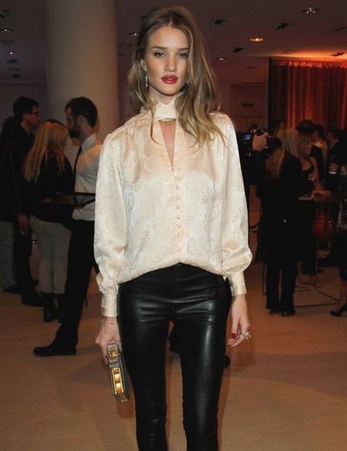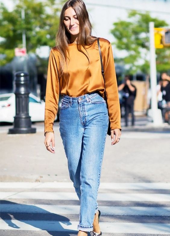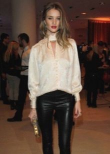 A satin blouse will complement an evening outfit, if you combine it with classic narrow or wide, heavy-fitting pants. Do not forget the shoes with heels and bright accessories.