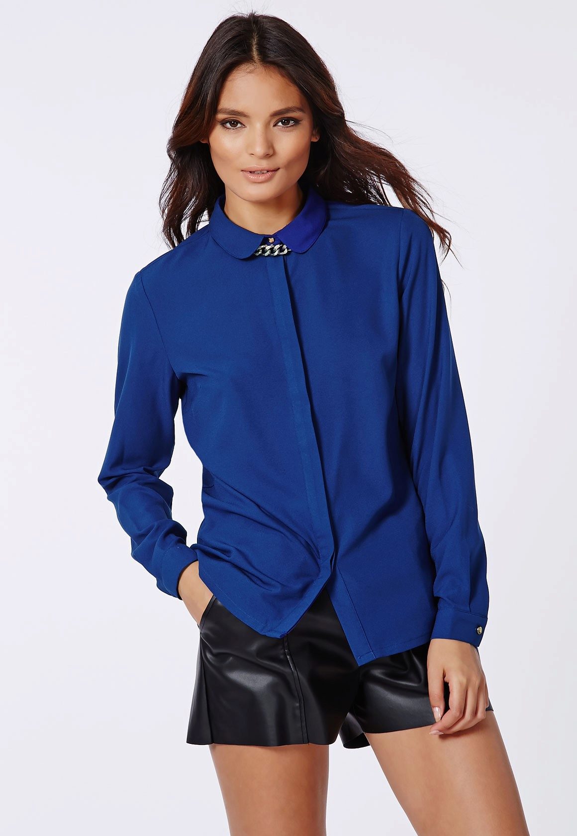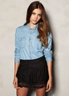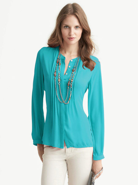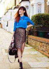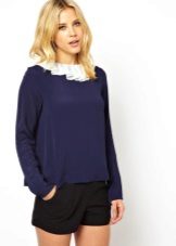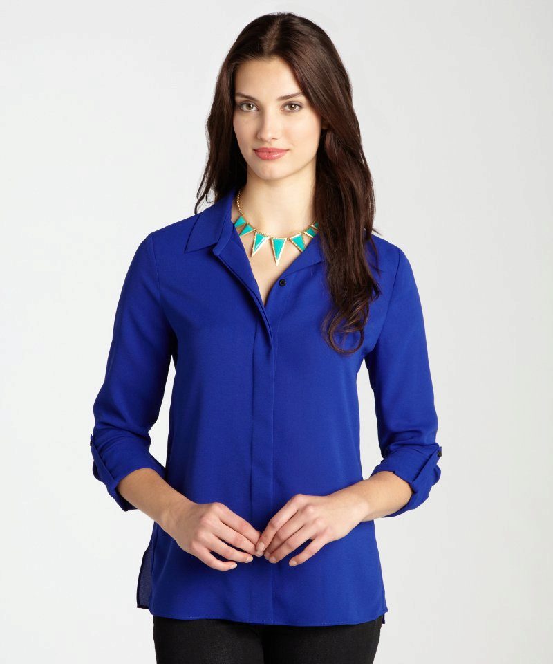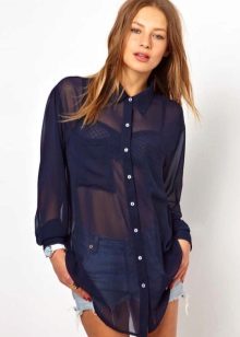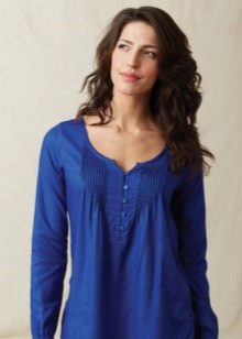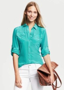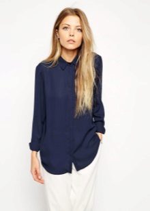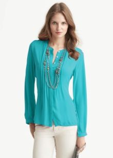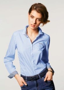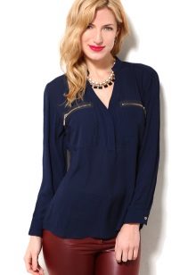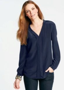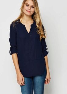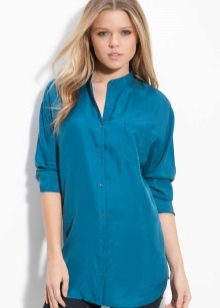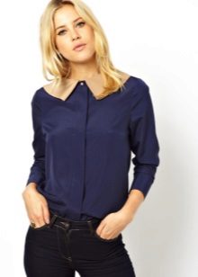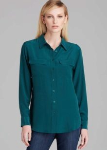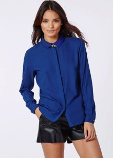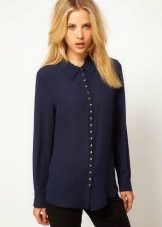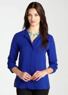 Strict blue blouse is popular with office workers. Her style is reminiscent of a male, the classic model with a turn-down collar can be worn buttoned at all buttons or unbutton a few upper ones. This blouse is easy to combine with a jacket, cardigan, jacket business style.