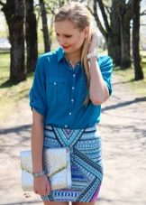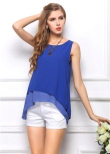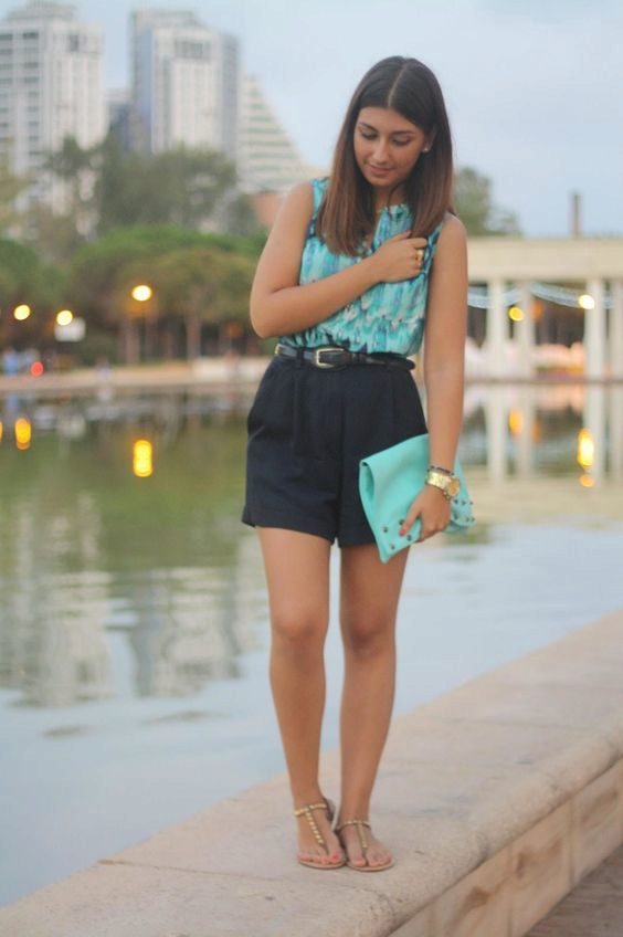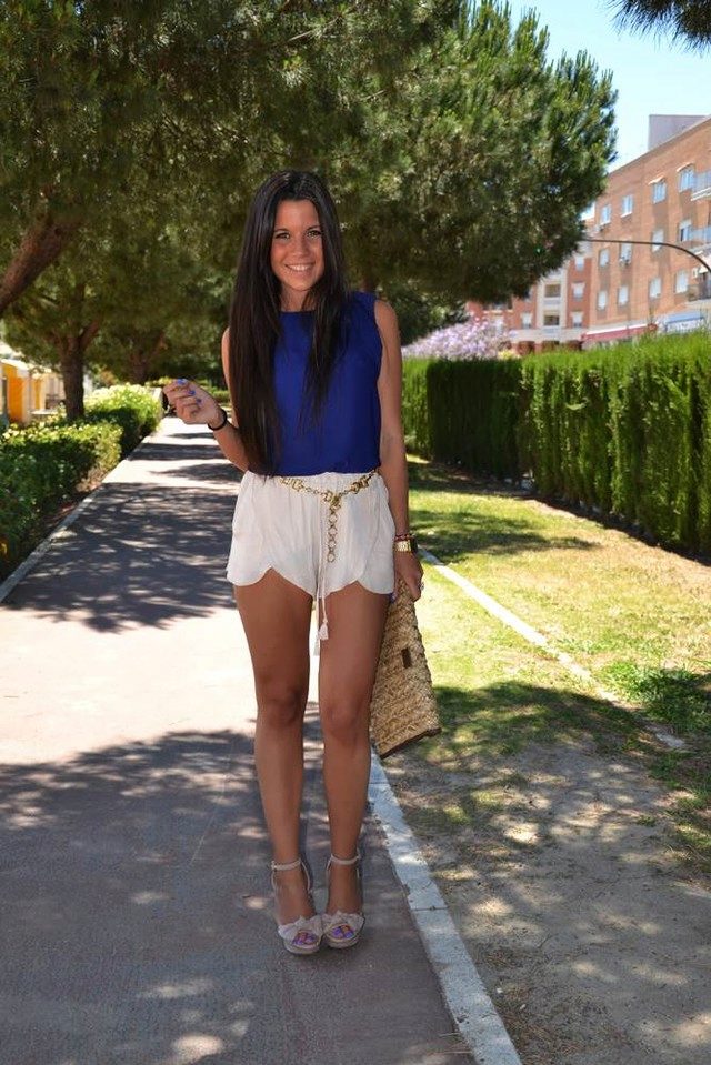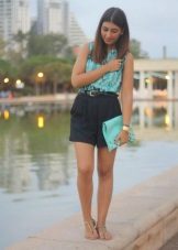 - Going to a summer party? Then put on a blue blouse with white shorts-petals, put on high-heeled nude sandals, complement the image with a golden belt and a light clutch. Get a trendy and colorful look!