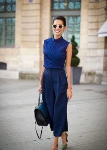 - A light blue striped blouse is perfect for an office look. To make it look stylish and not boring, wear it with dark blue culottes, complementing the image with brown accessories: high heels, a voluminous bag and a thin belt at the waist.