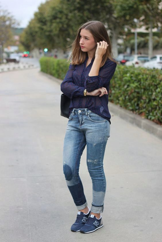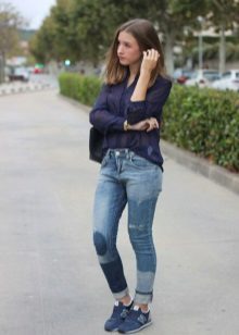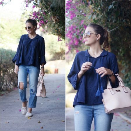 - Laconic and comfortable image for every day. Blue peasant blouse, boyfriends with holes, light slip-on sneakers and a beige bag. Sunglasses and minimalist jewelry complement this look.