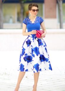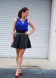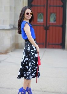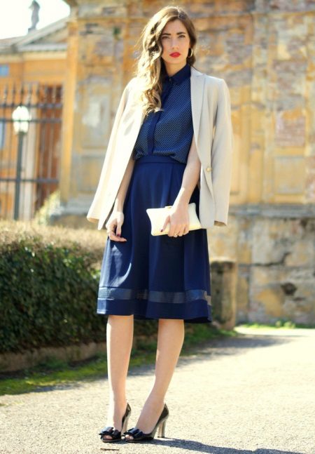 - Feminine image, which is suitable for office work, and for a romantic date. A dark blue blouse with small polka dots, a fluffy skirt of the same shade and a beige blazer casually thrown over the shoulders. Look complemented by black lacquered slippers, a small light clutch and earrings in the form of ringlets. The accent is bright red lipstick on the lips.