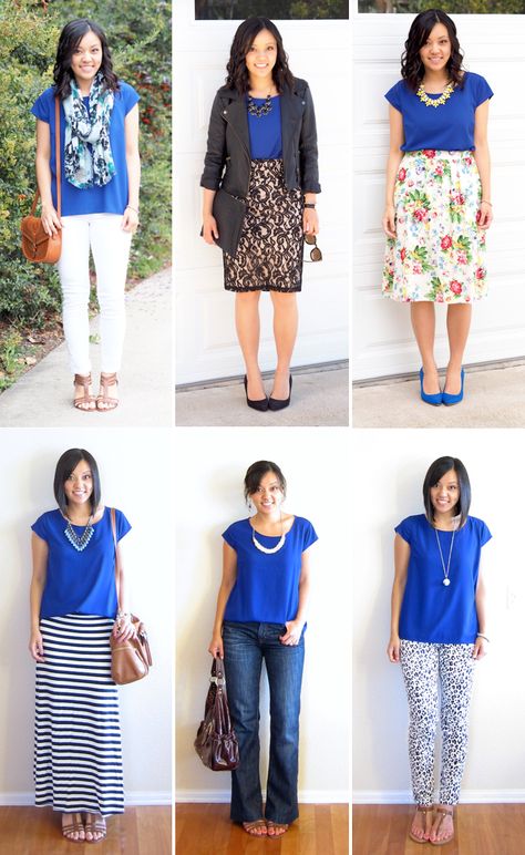 Let's take a look at how well the blue blouse goes well with jeans, culottes, skirts and shorts. A truly universal thing.
